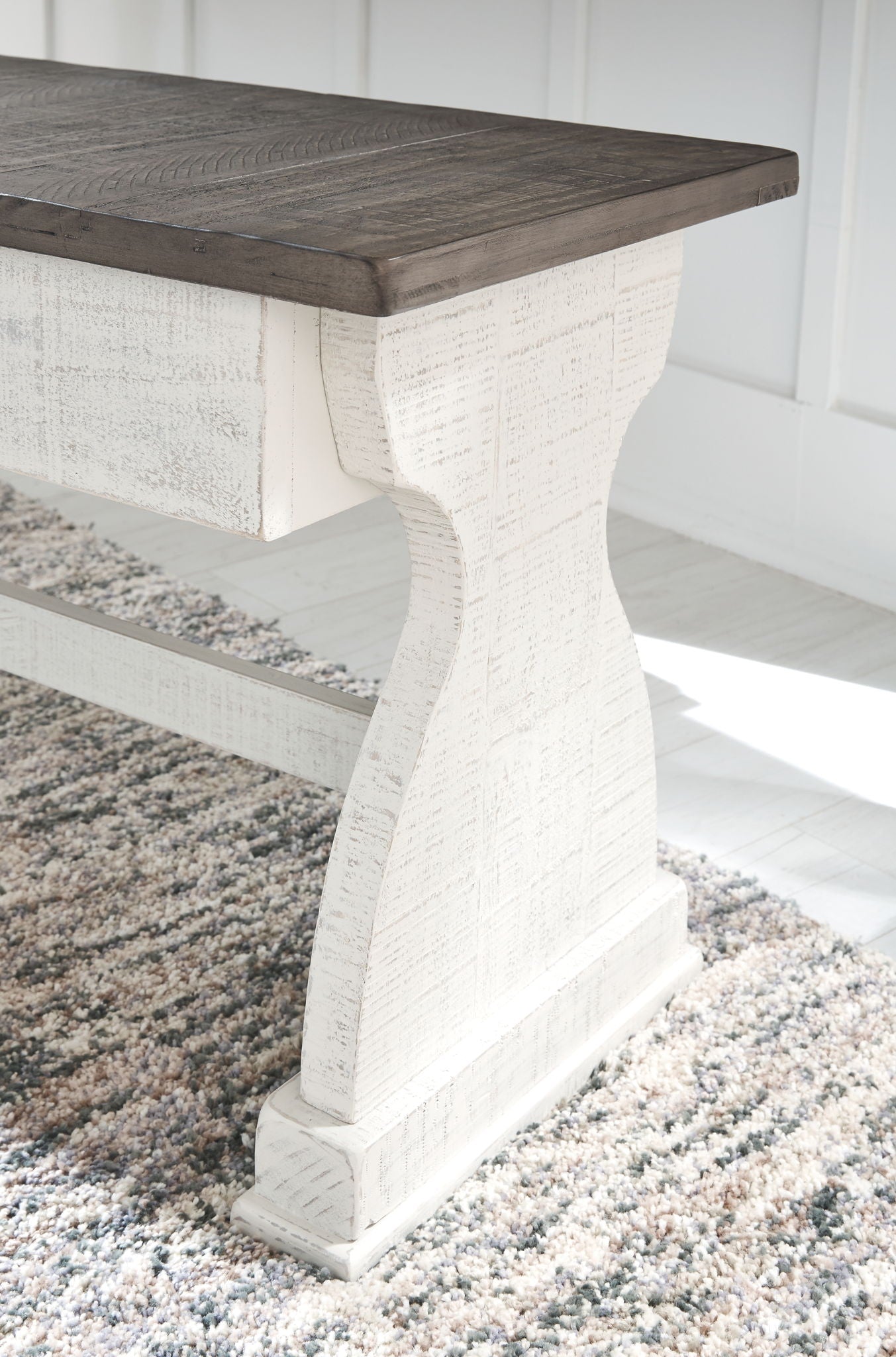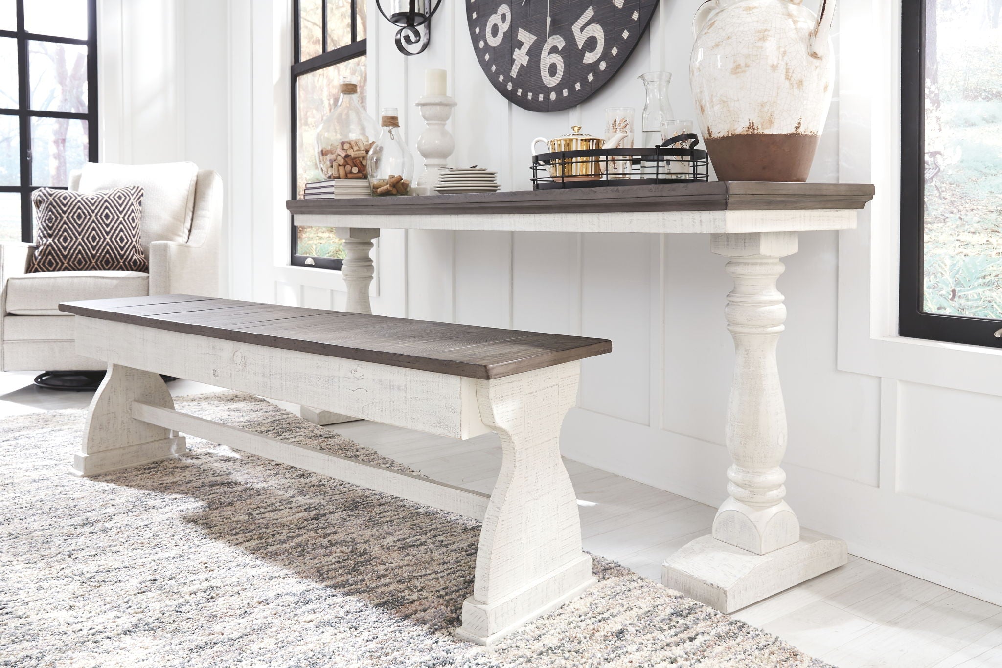 A charming choice with high-quality craftsmanship, this dining table set may be modest in scale, but it’s packed with possibilities. Spanning 79" in length, the long and narrow table not only accommodates small dining areas but also fits nicely behind a sectional or sofa. Church pew styled bench includes a hinged top revealing a storage bin that’s perfect for placemats, table linens and more. Two-tone finish of distressed weathered gray and distressed vintage white is a feast for the eyes.