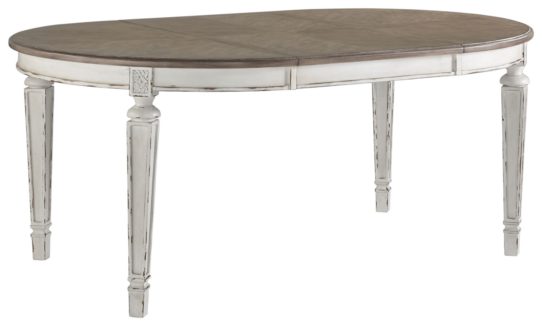 Bon appétite. This dining room extension table has all the right ingredients for a French country-inspired feast for the eyes. Antiqued two-tone aesthetic pairs a chipped white with a distressed wood finished top for a double serving of charm. Drop-in leaf allows you to comfortably accommodate eight.
