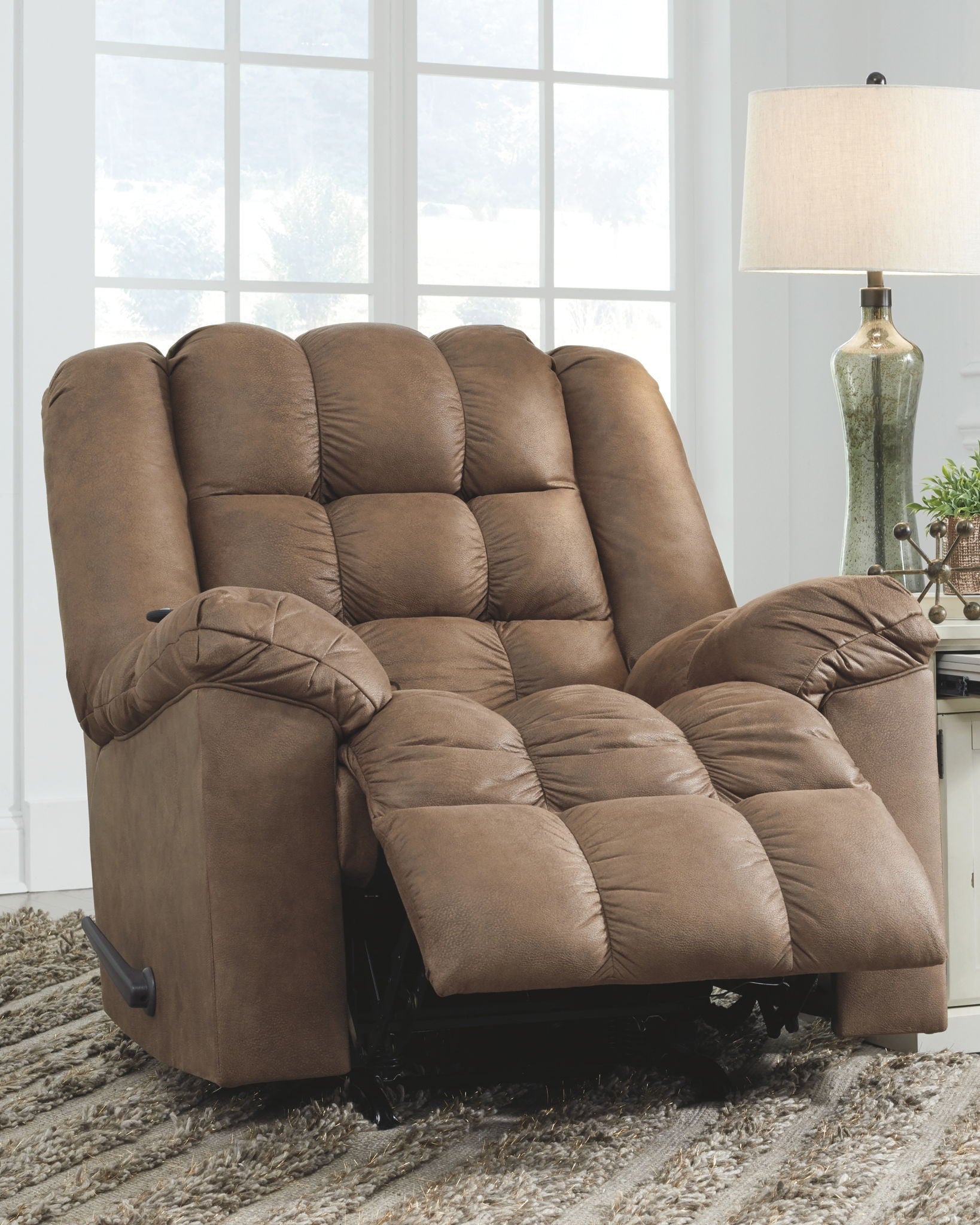 A sight for sore eyes—and tired muscles—this rocker recliner invites you to sack out in high style. Sumptuous bustle back cushioning with heat and massage feels every bit as indulgent as it looks. Weathered brown faux leather blends effortlessly with anything and everything.