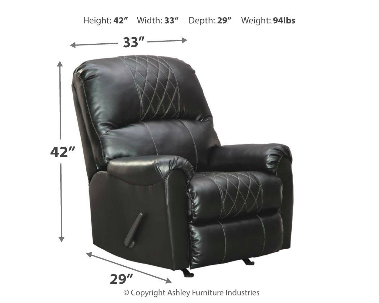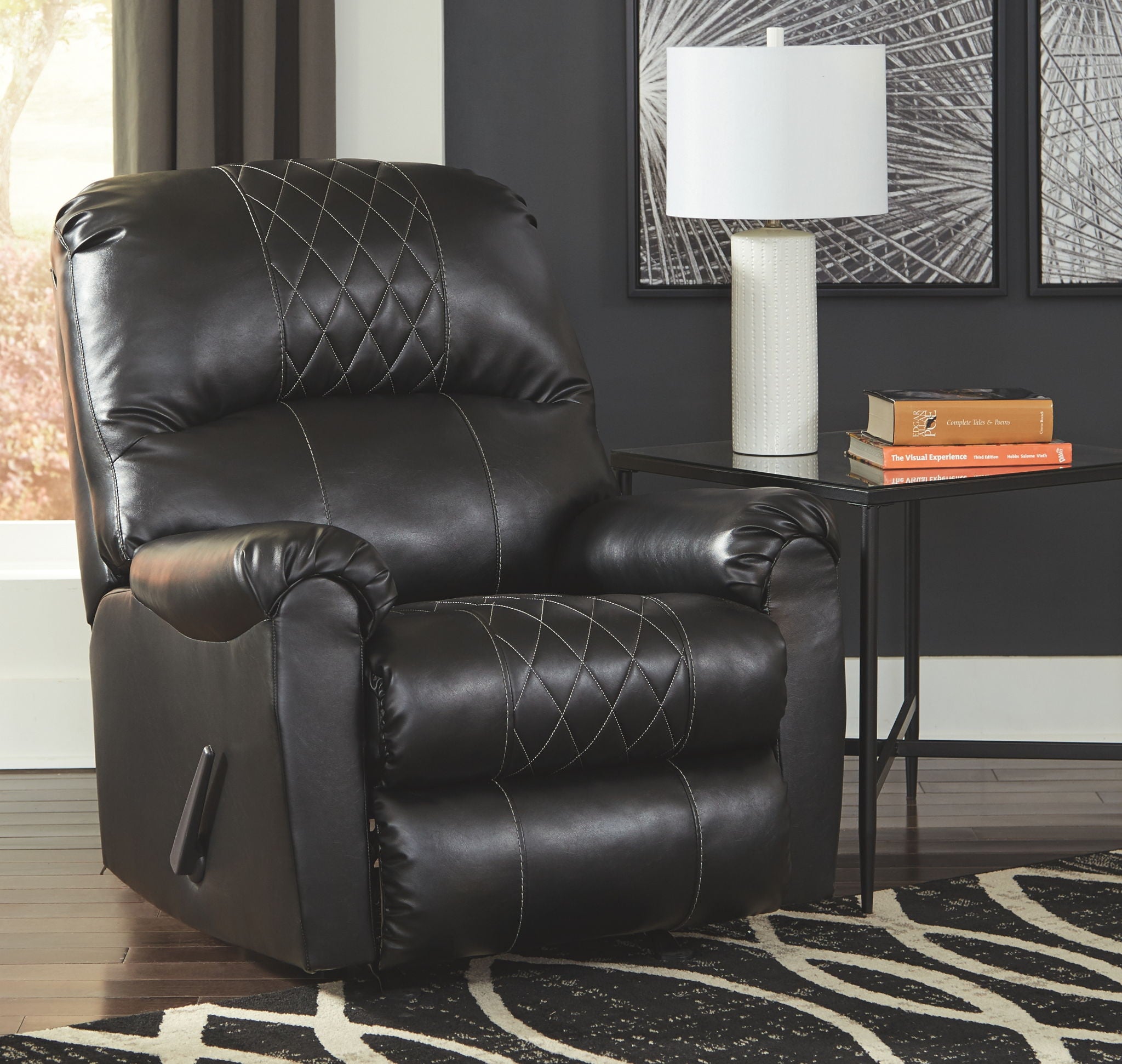 Great design draws inspiration from various places, and this rocker recliner is no exception. Diamond-stitched pattern seen in high-end handbags and luxury car interiors is simply irresistible on this sumptuous, generously padded seating experience. Durable, easy-care leather alternative delivers the look you crave at a price that’s decidedly easy on your purse. With one easy pull, you’re on your way to endless relaxation.
