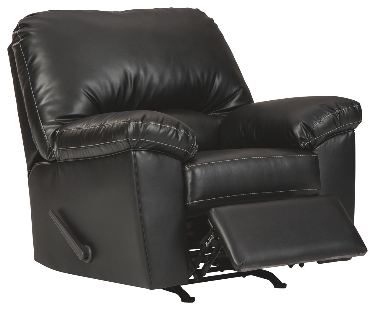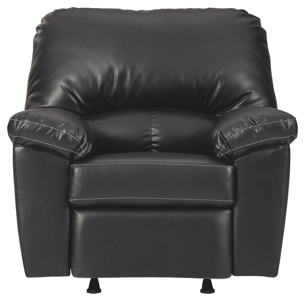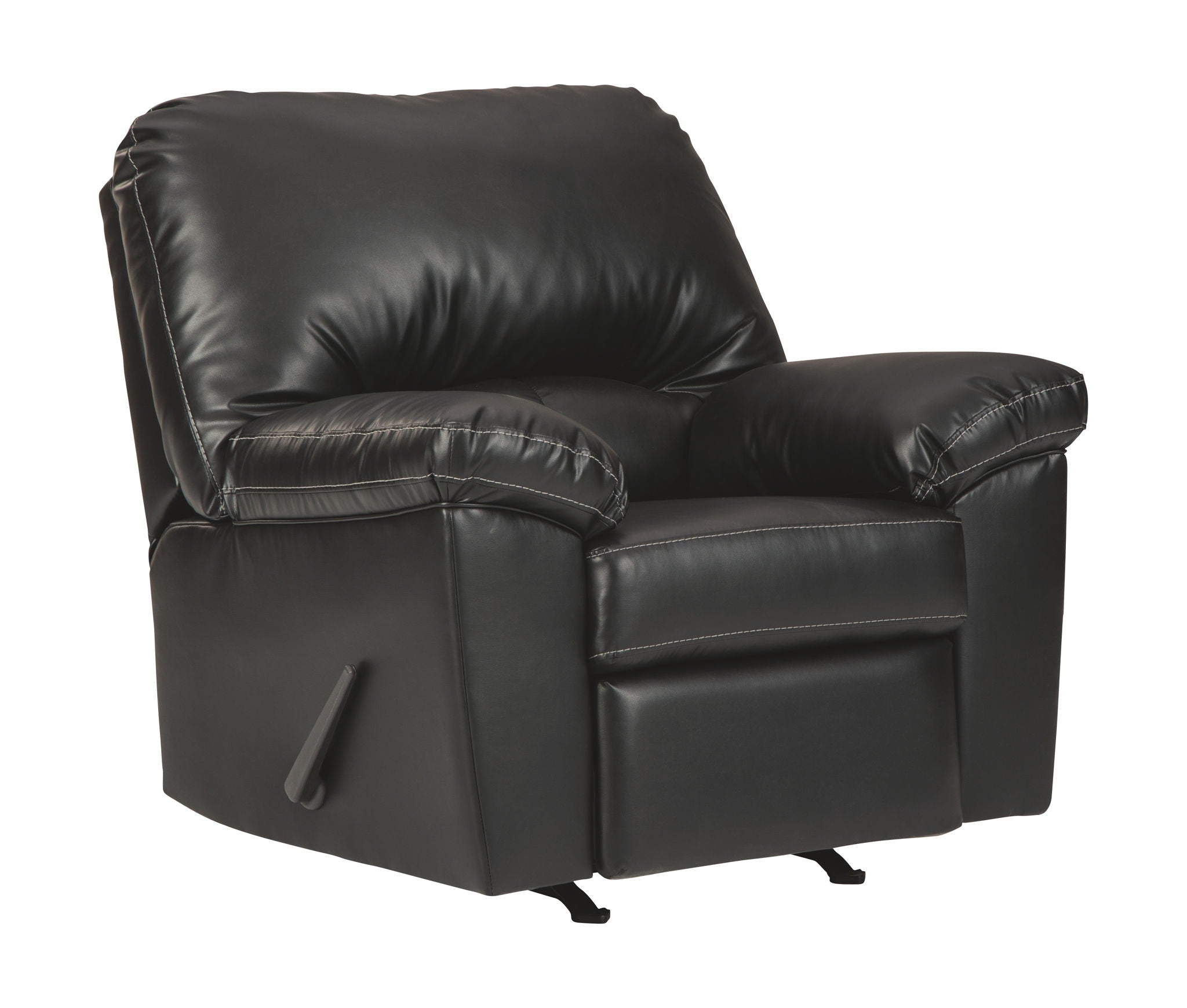 Indulge your lust for comfort and love for contemporary design with this rocker recliner. Made for easy, everyday living, it’s upholstered in a heavyweight padded faux leather, accented with contrast jumbo stitching for fashion-forward flair. Divided back design puts pillow plushness and support right where it’s needed most. Overstuffed pillow top armrests are the stuff dreams are made of.