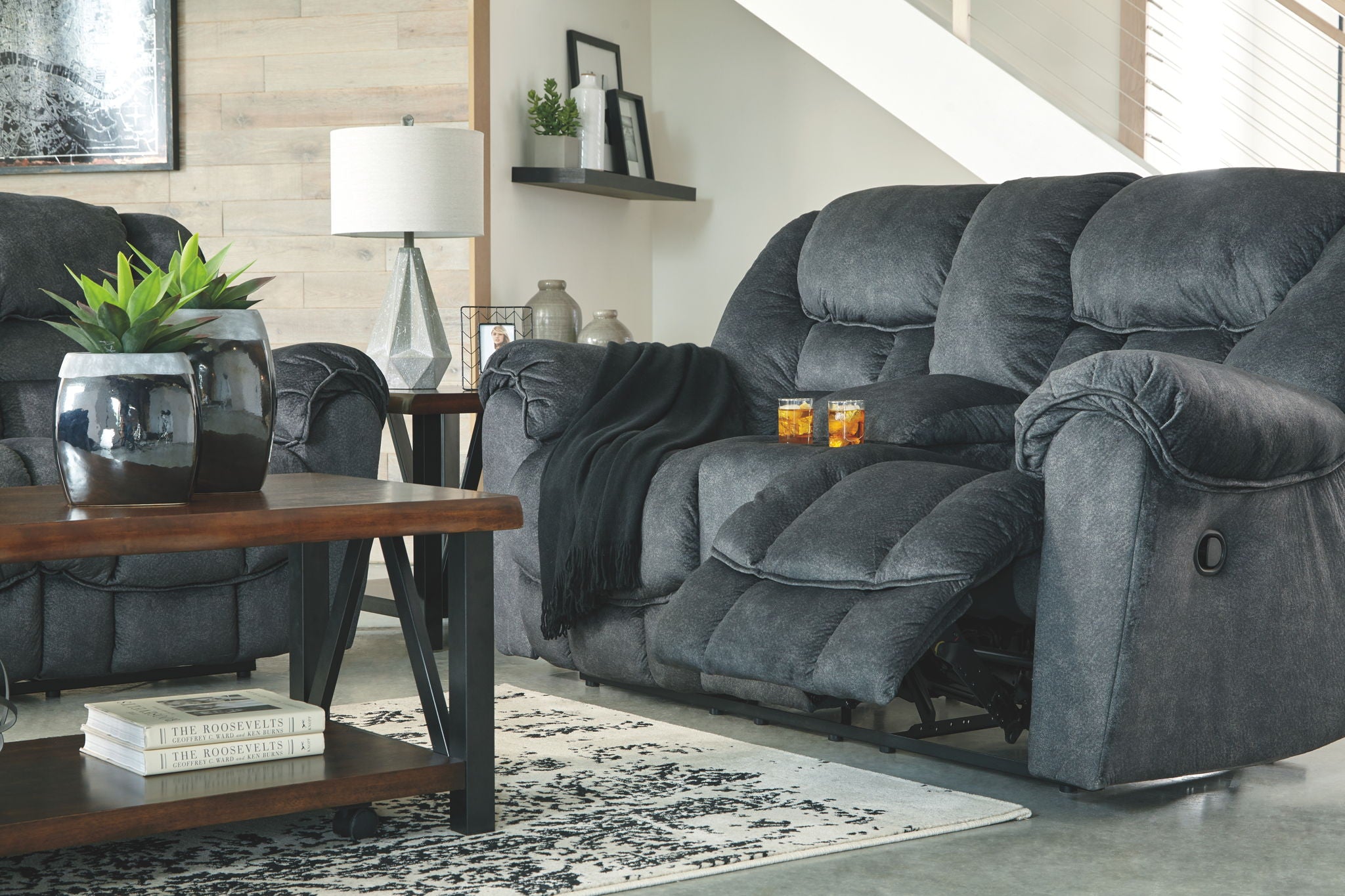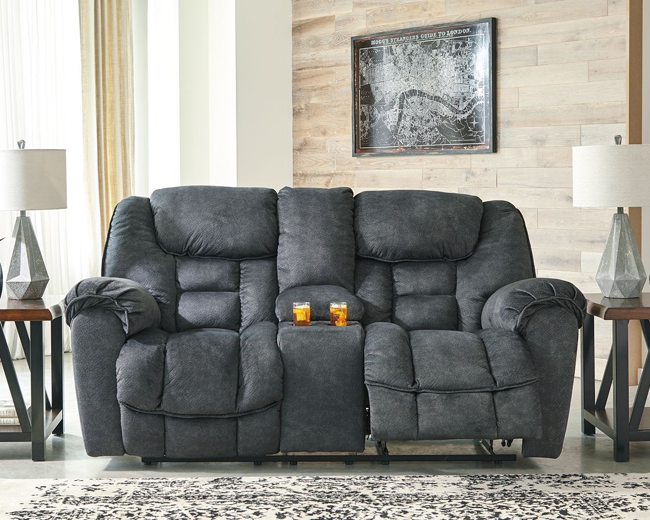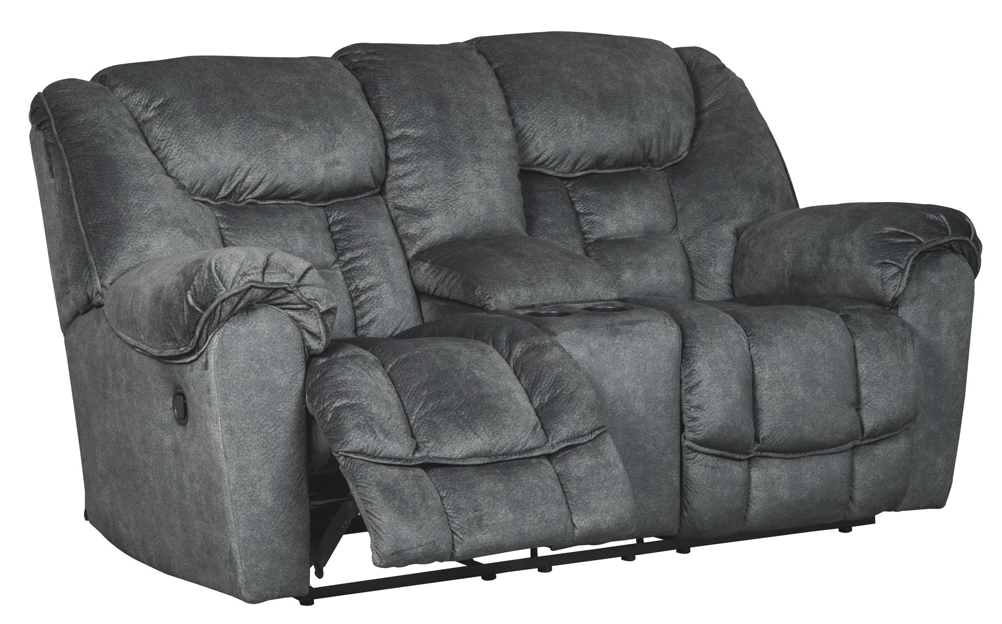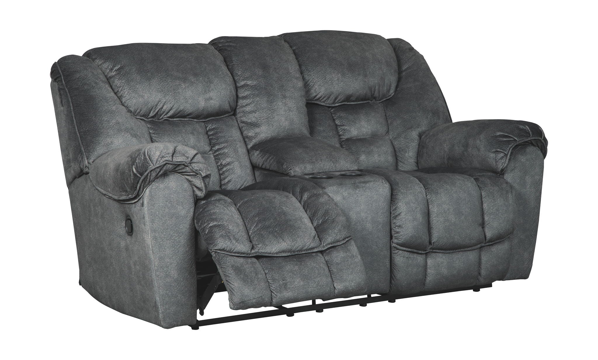 Sometimes seeing is believing. Rest assured this reclining loveseat with console is every bit as indulgent as it looks. Designed to put you in the lap of luxury, this generously scaled reclining sofa—wrapped in a wonderfully plush and practical granite gray upholstery—sports scooped pillow wrapped armrests and curvaceously cushioned head-neck support for feel-good flair.