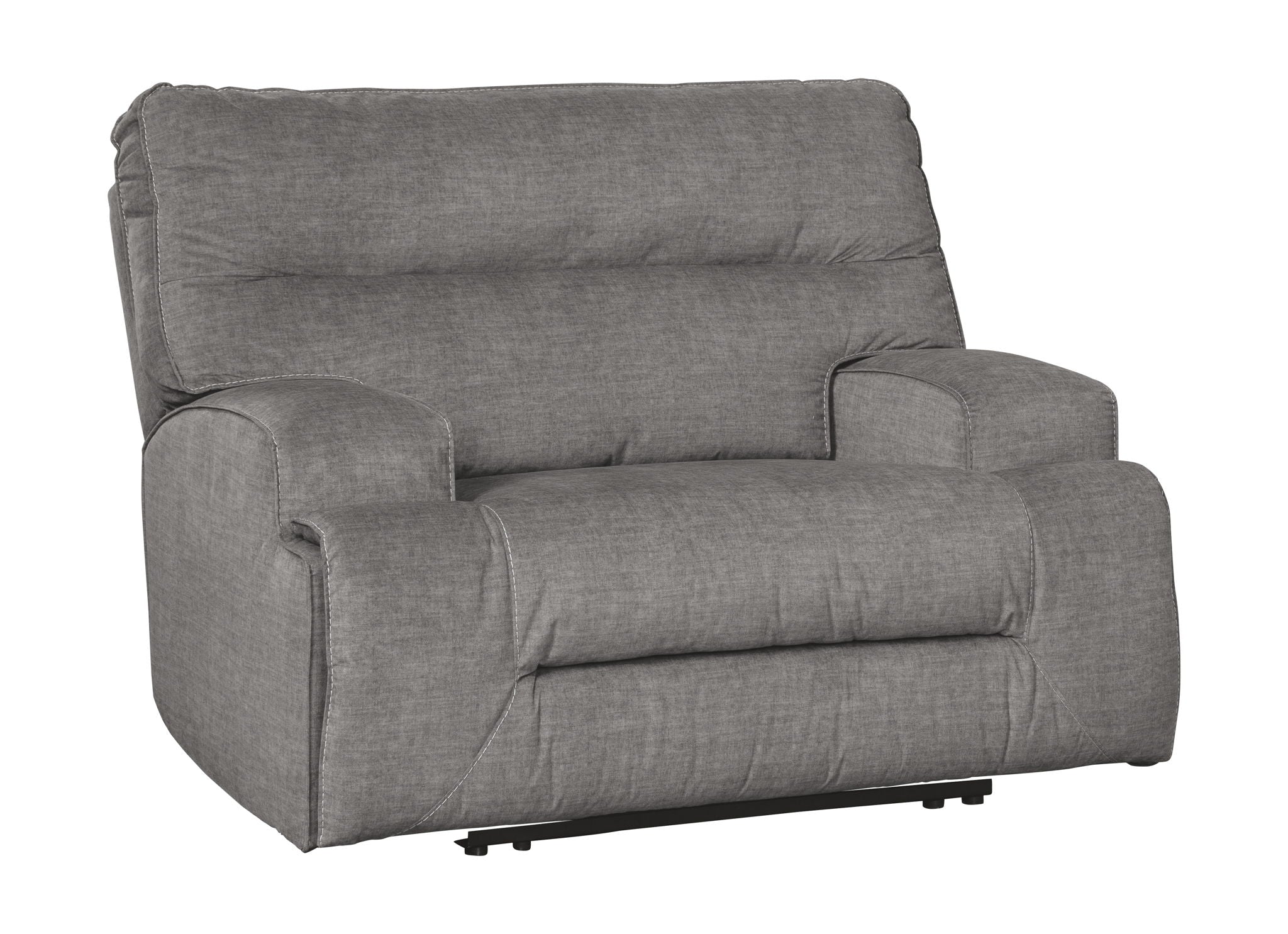 This wide seat recliner makes it hip to be square. Brilliantly boxy profile and wide track arms infuse a highly contemporary look you don’t often find in reclining furniture. Rest assured, the trendy charcoal-tone upholstery is sumptuously soft—and made all the more enticing with deep channel tufting for clean-lined flair.