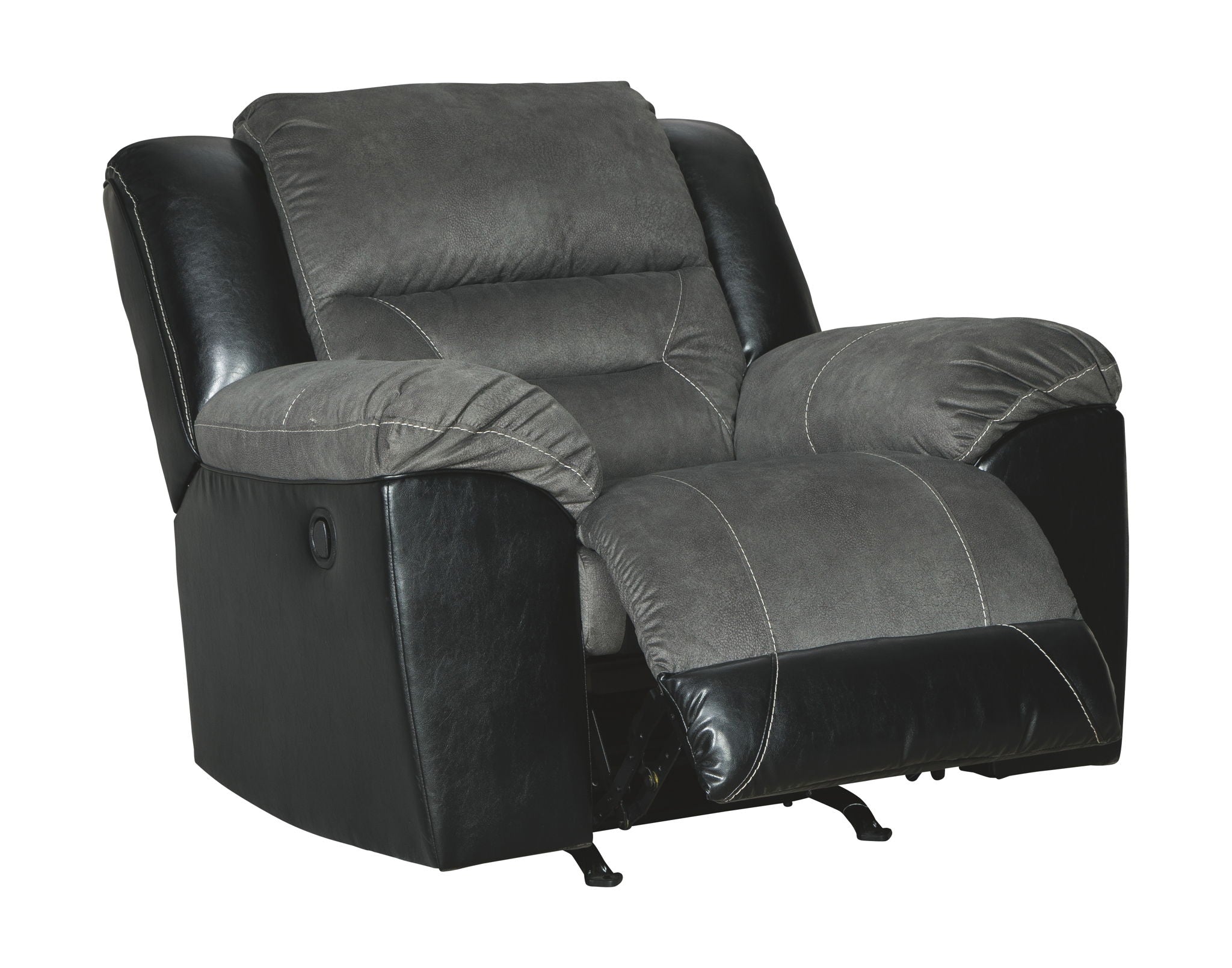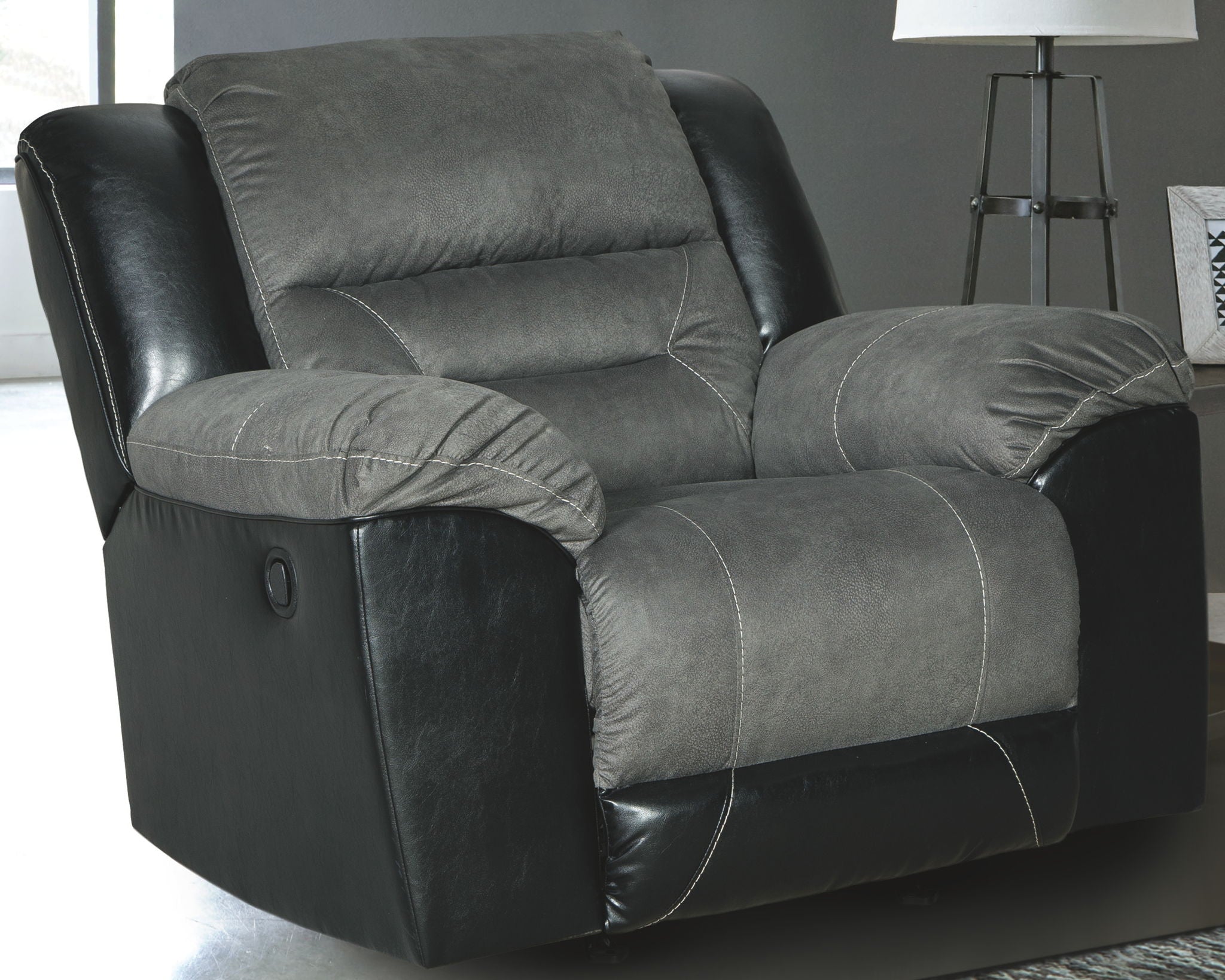 Every day is a good day with this rocker recliner around. Take a load off and forget your worries as you ease back into the luxurious feel of suede-like fabric. Faux leather covers the outside parts for an elevated look. Need more comfort and support for your body? Cue the deep seating and tall back. Contrast jumbo stitching adds an element of style to the cushions.