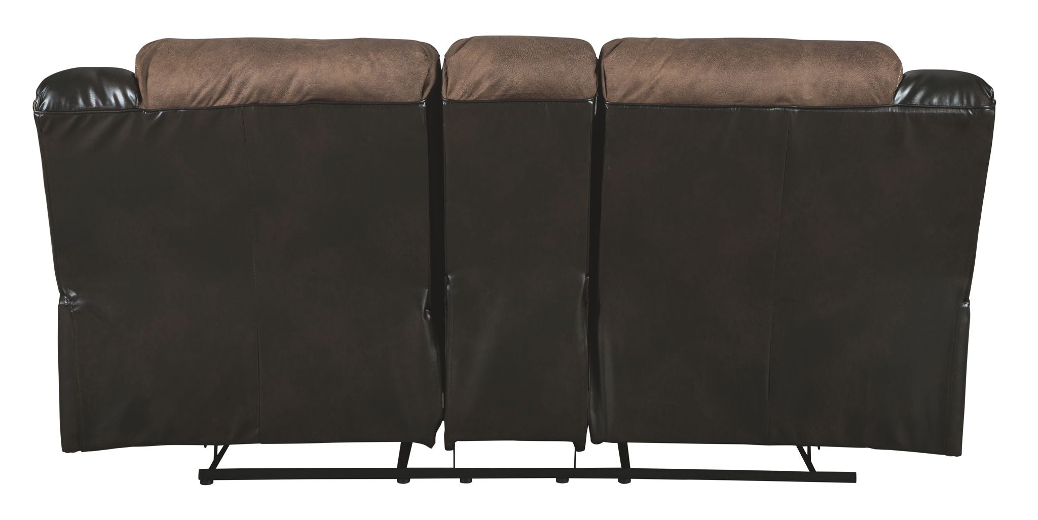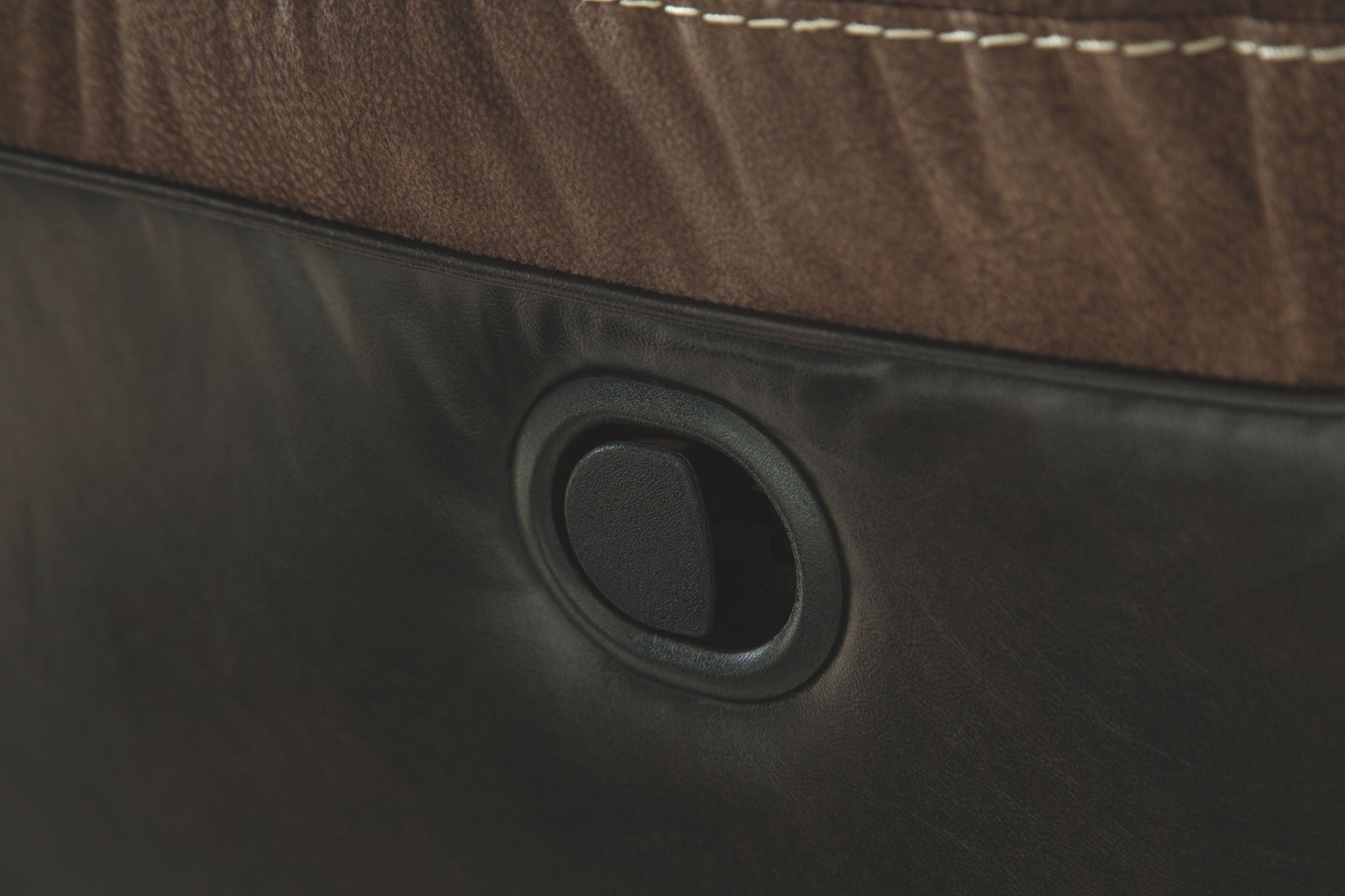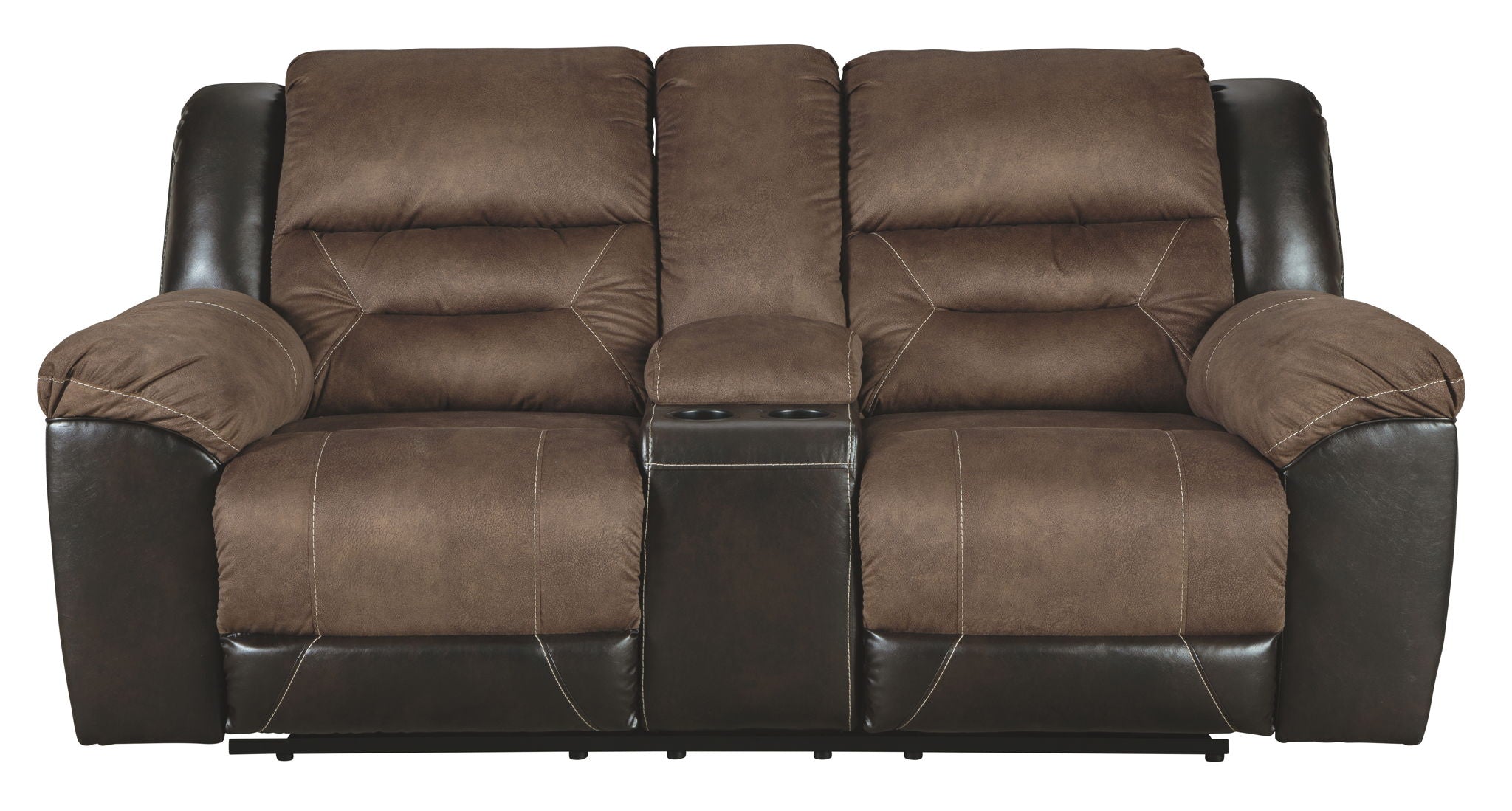 Every day is a good day with this reclining loveseat around. Take a load off and forget your worries as you ease back into the luxurious feel of suede-like fabric. Faux leather covers the outside parts for an elevated look. Need more comfort and support for your body? Cue the deep seating and tall back. Contrast jumbo stitching adds an element of style to the cushions. Easily place drinks and small living room essentials in the center storage console with cup holders.