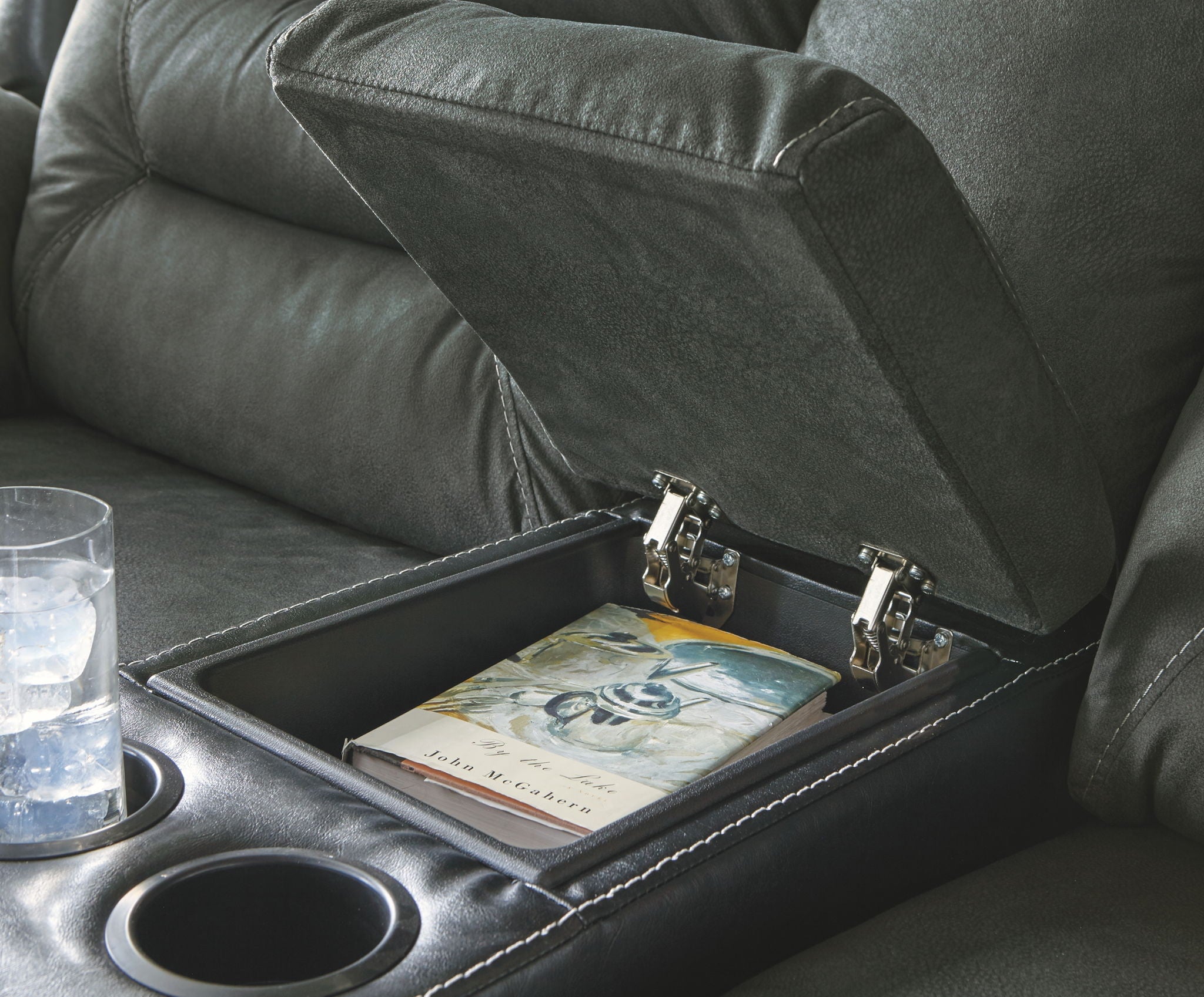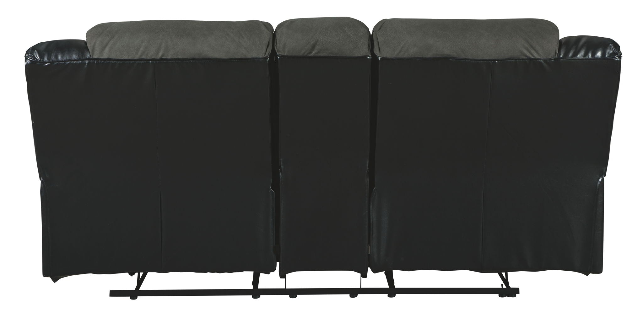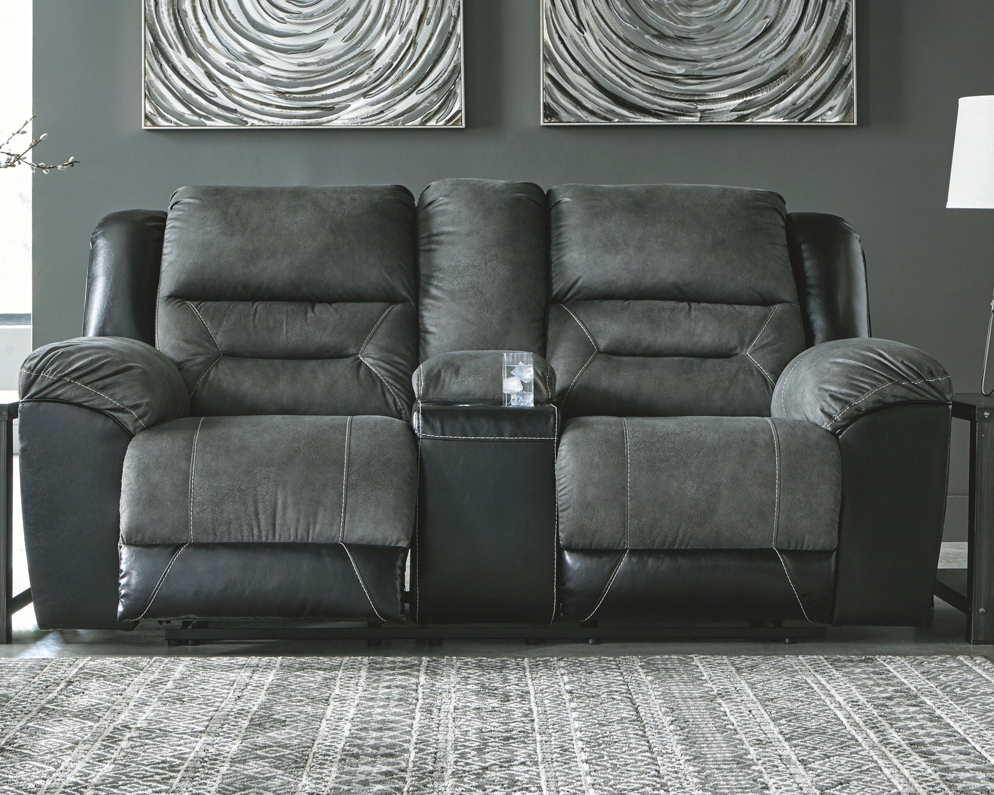 Every day is a good day with this reclining loveseat around. Take a load off and forget your worries as you ease back into the luxurious feel of suede-like fabric. Faux leather covers the outside parts for an elevated look. Need more comfort and support for your body? Cue the deep seating and tall back. Contrast jumbo stitching adds an element of style to the cushions. Easily place drinks and small living room essentials in the center storage console with cup holders.