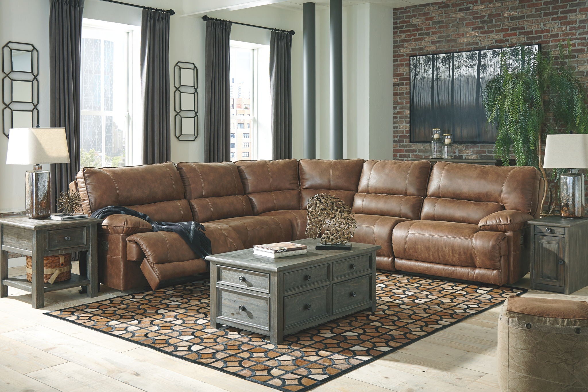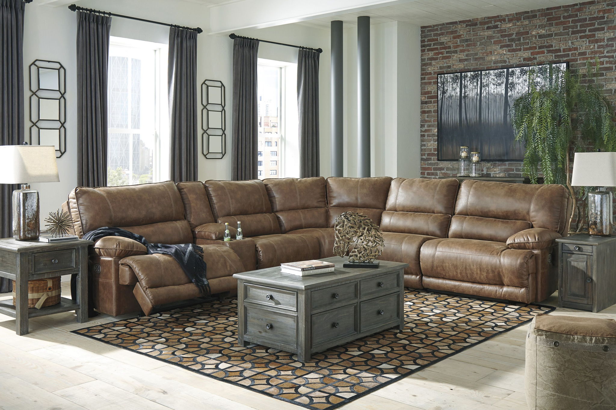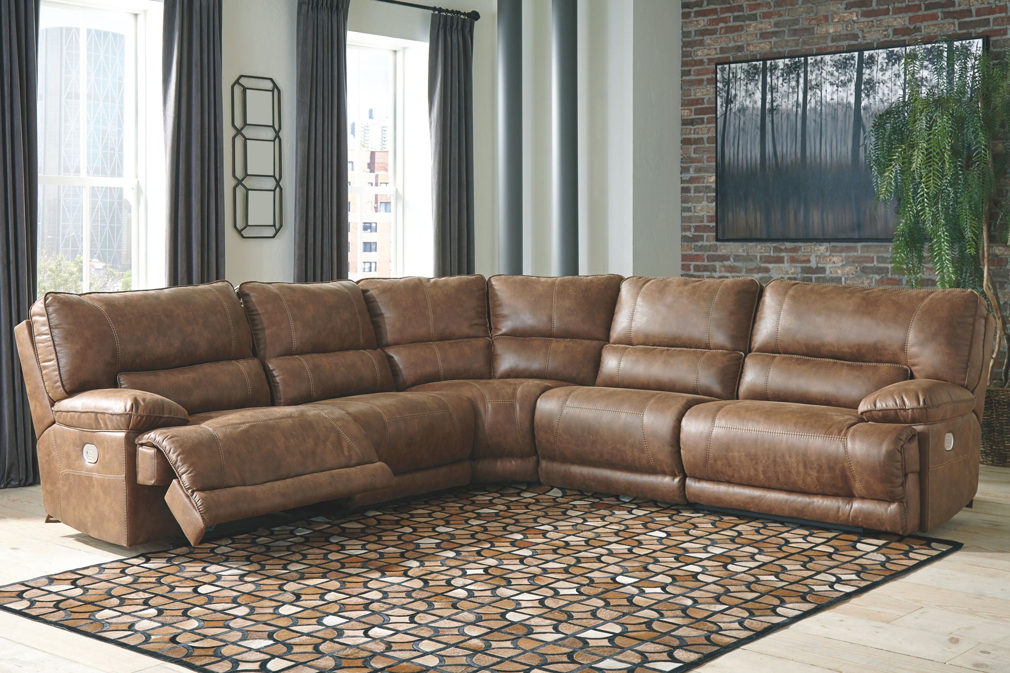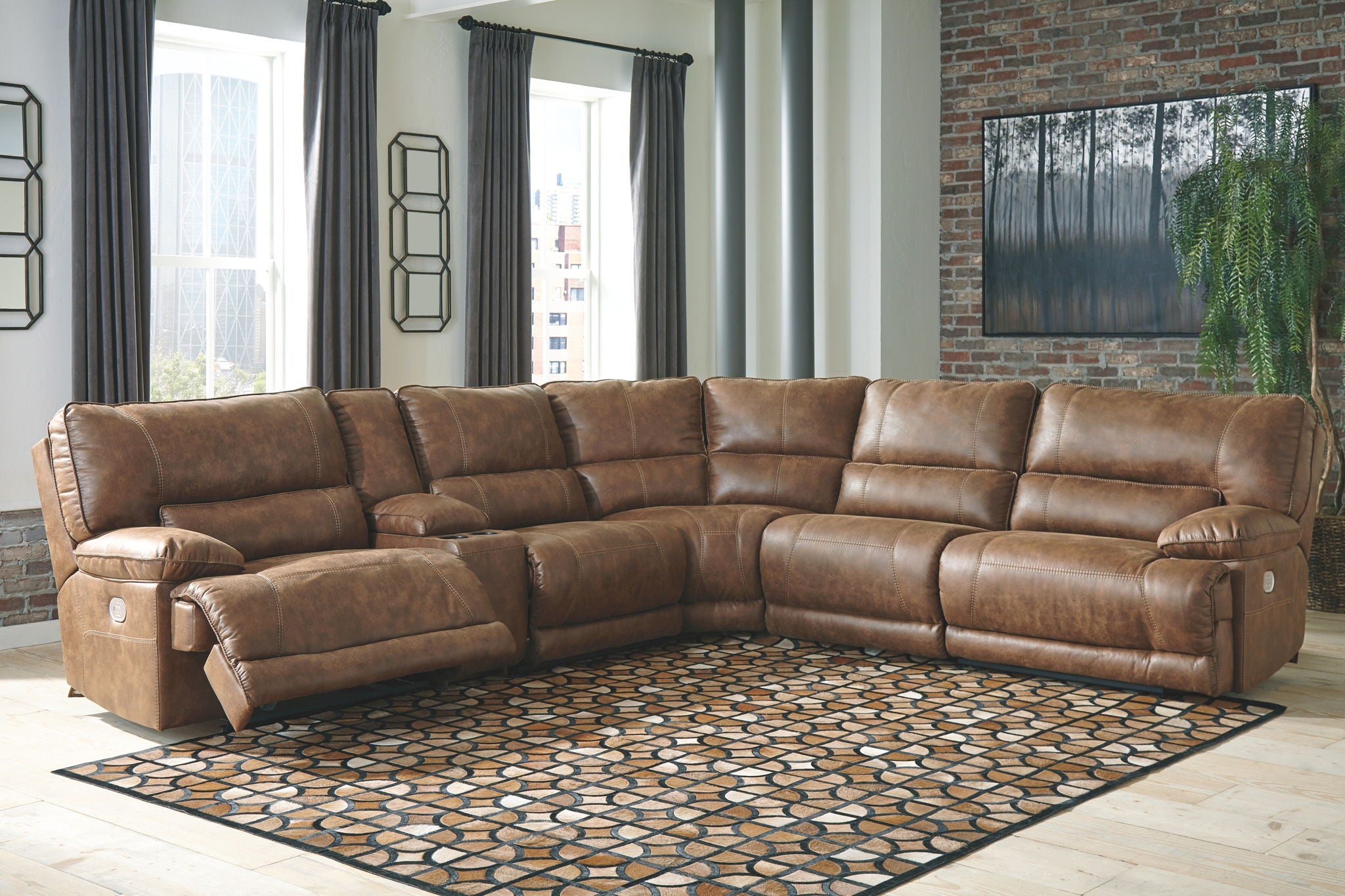 Saddle up for a newfound level of comfort and style with this 6-piece power sectional in saddle brown. Sporting a trendy upholstery that looks like broken-in leather but has the warm feel of fabric, this power sectional is as cool as it is cozy. And talk about accommodating from head to toe. Easy View™ power adjustable headrests let you fully recline and still have a prime view of the TV, while extended ottomans let you stretch out that much more. Chill out while you recharge thanks to a USB charging port built right into the one-touch power control.