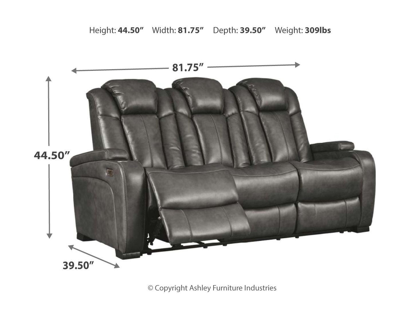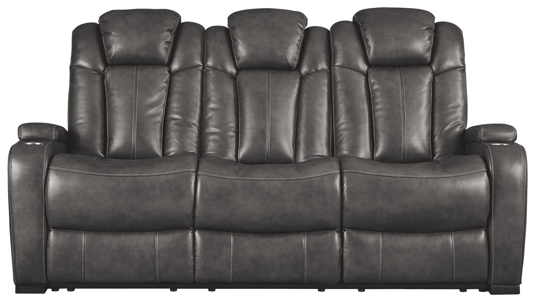Looking for seating with all the bells and whistles? This loaded power reclining sofa has you covered. Get double the relaxation—recline your body then adjust your headrest. Pull down the middle seat to reveal a drop down table ready to hold your magazines and remotes. With USB charging ports, your devices will enjoy this sofa, too. Stainless steel cup holders accompany you on either side. All wrapped up in quality faux leather with fashion-forward jumbo stitching for a look and feel you’ll love.
