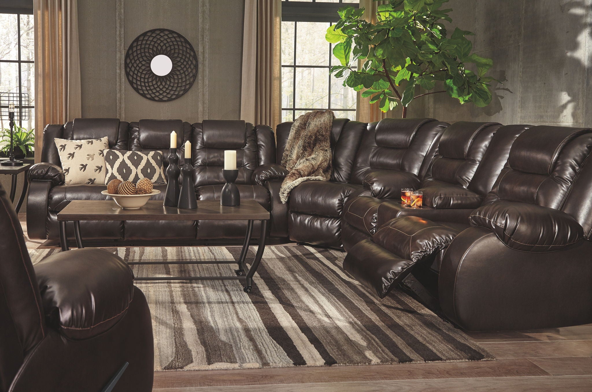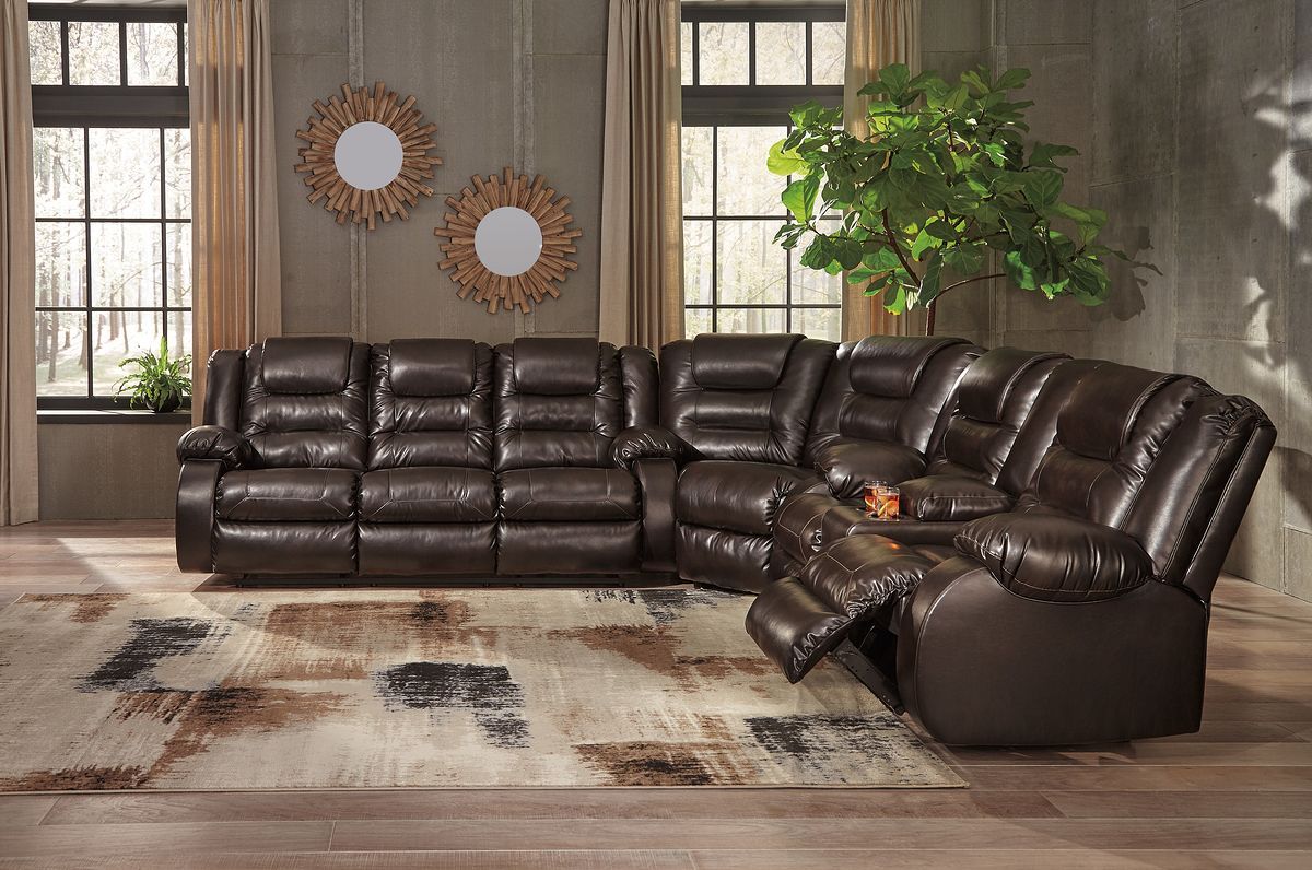 This 3-piece reclining sectional puts comfort in style. Plush cushions are stitched to perfection. Ease back into the deep seating to rest your head on the supportive headrest. Supple fabric gives your room the high end look of leather with a spicy pop of color. You’ll love how easy it is to recline in infinite positons of relaxation. Drop a beverage in one of the cup holders, and enjoy sitting here for hours.