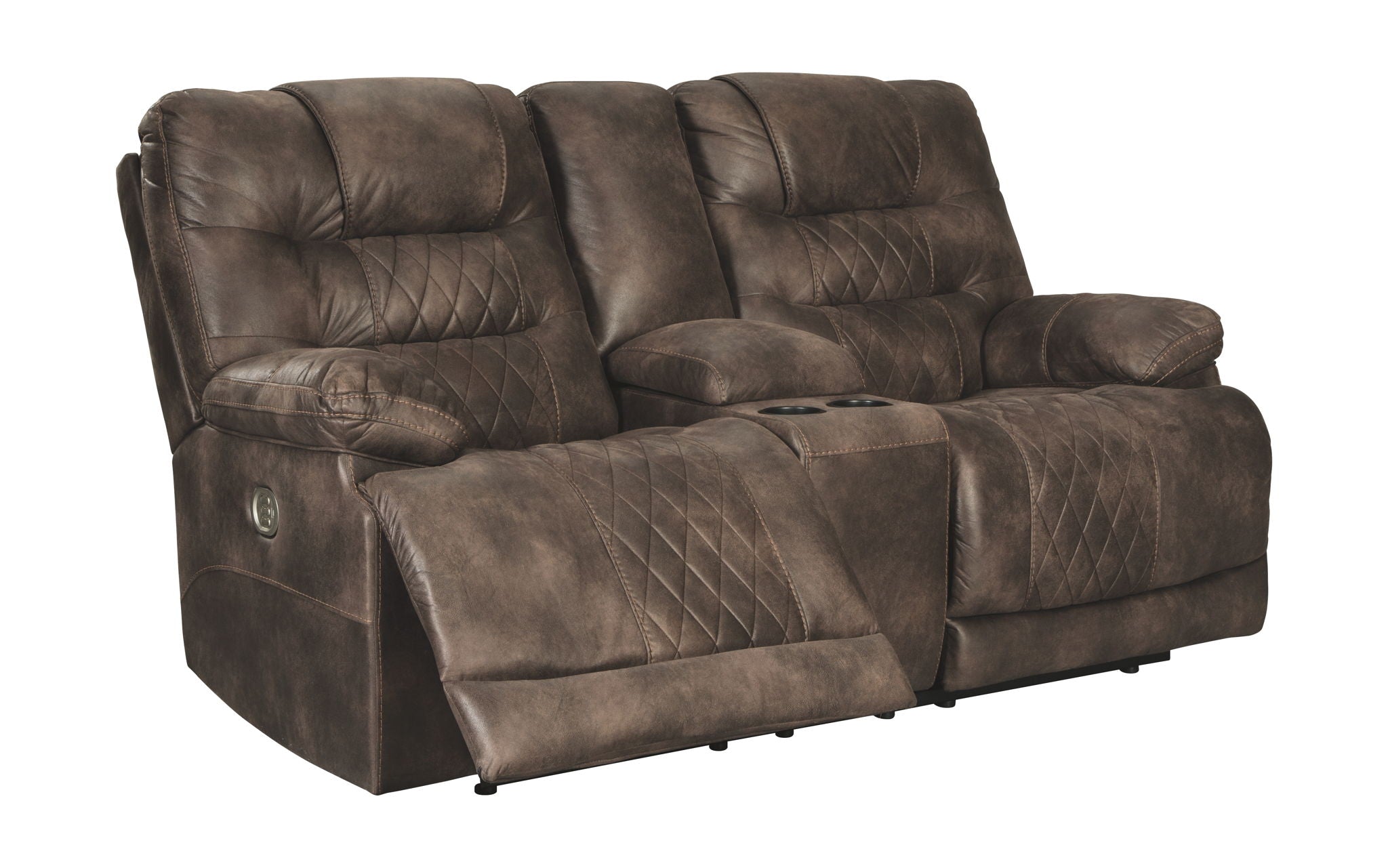 From head to toe and all points in between, this faux leather power reclining loveseat in walnut brown has you covered with chic style and sumptuous comfort. A reclining loveseat designed to respond to your every move, it includes not only an Easy View™ power adjustable headrest—allowing you to recline and still have a great view of the TV—but also power lumbar support to get you feeling back on track. Merging the cool look of leather with the warm feel of fabric, this power reclining loveseat’s enticing upholstery is enhanced with distinctive diamond lattice stitching for fashion-forward flair. Perks such as an easy stretch extended ottoman and USB charging port in each control panel extend your comfort level.