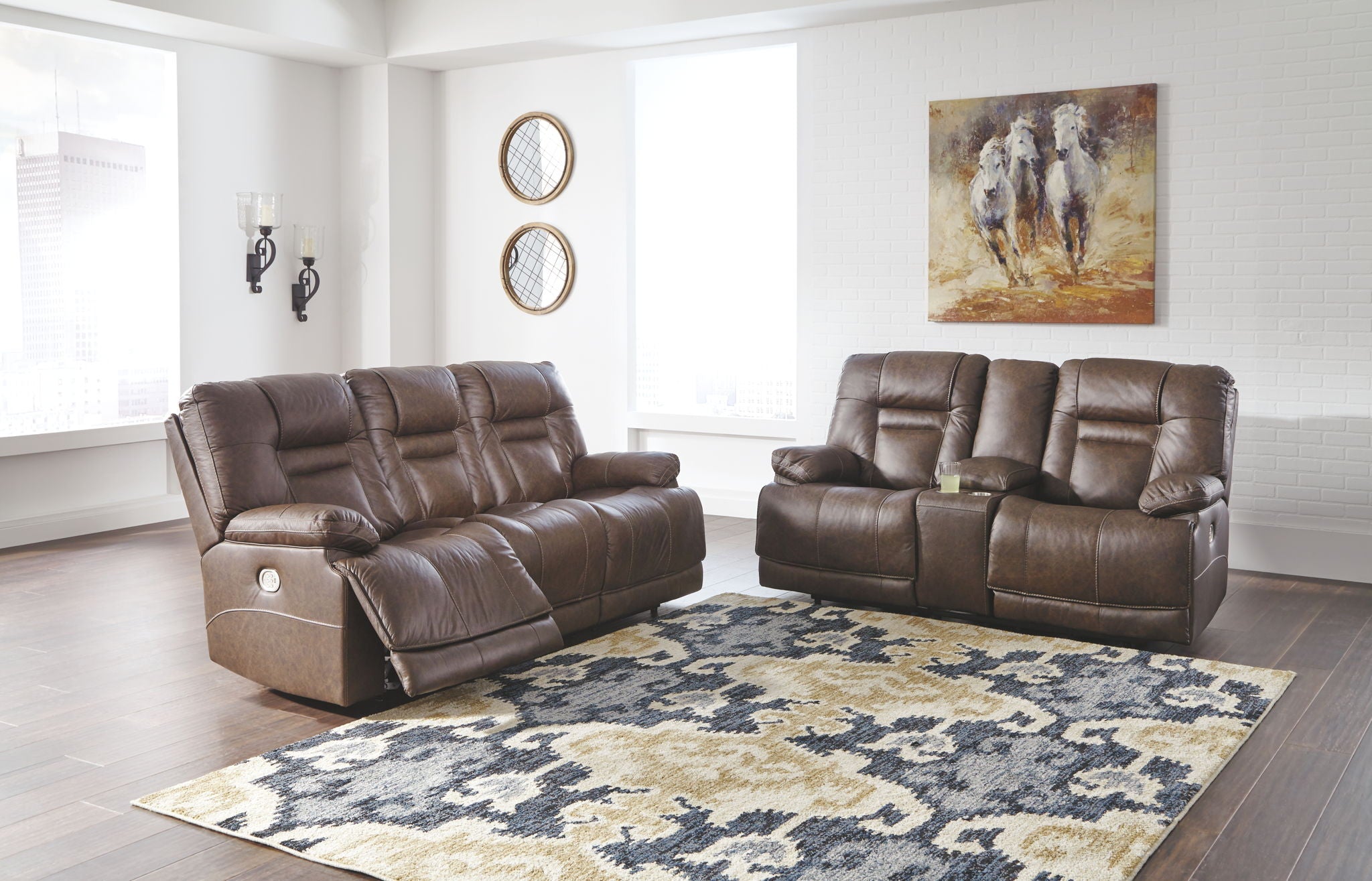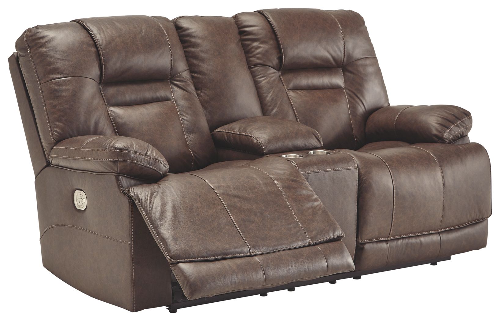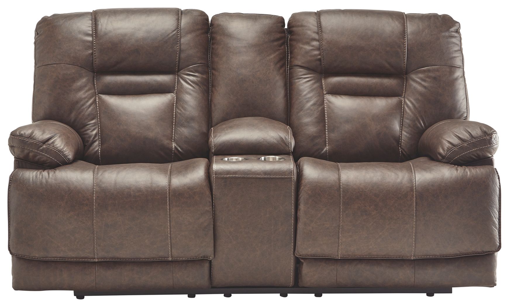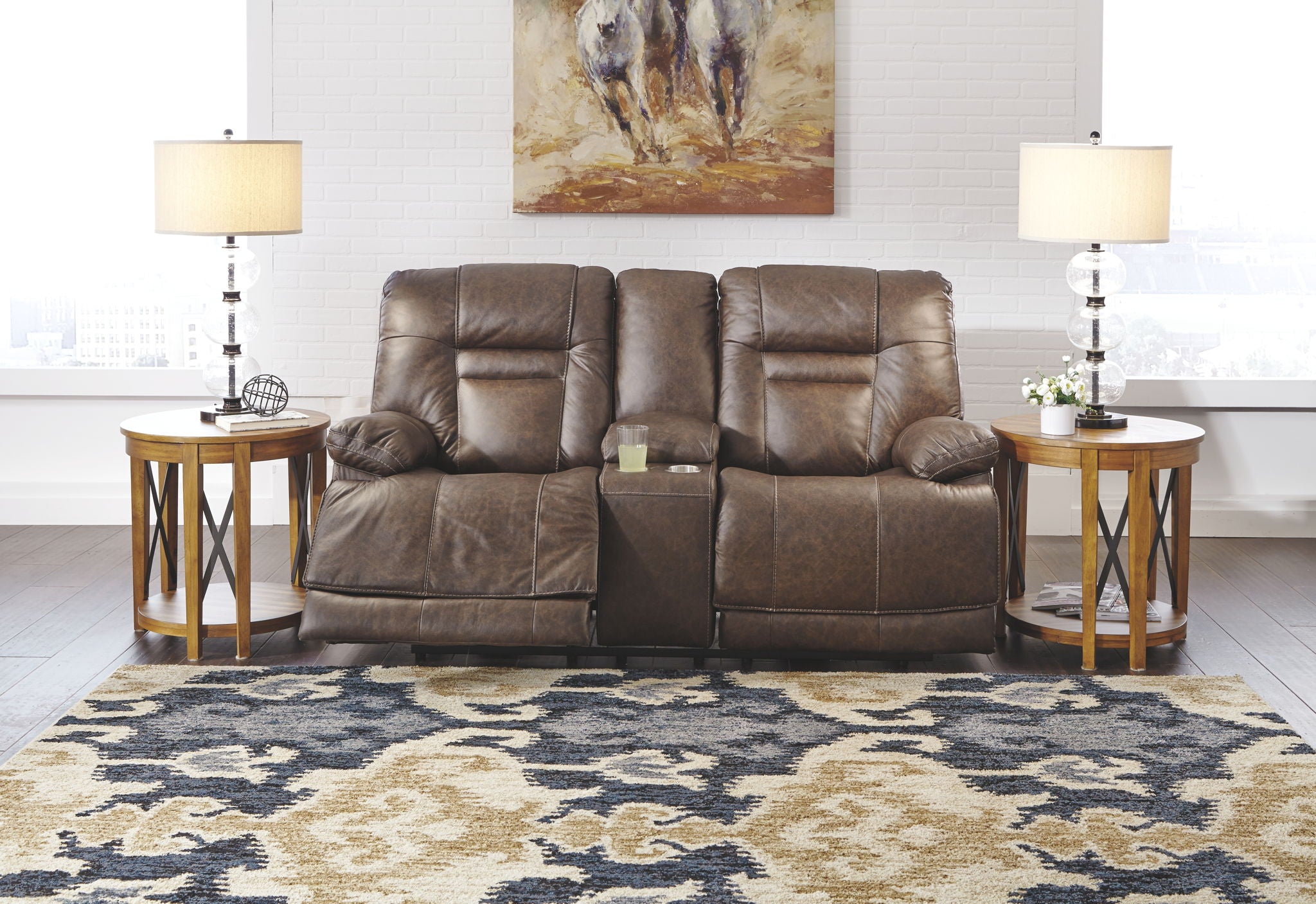 Big and bold, this power reclining loveseat with console and Easy View™ power adjustable headrests delivers comfort at the touch of a button. Easily position the recliner, its headrest and lumbar support to your liking for maximum comfort. Plus, with the convenient USB charging ports, cell phones or laptops can be charged without having to get up. The feel of heavy weight leather surrounds you via the cushioned seat, interior bustled back cushioning and pillow top armrest, while faux leather is on the back and sides for affordability. The cloud effect seen in the umber-colored upholstery creates a rustic look ideal for your modern or casual setting. The center console tops off convenience with hidden storage under center armrest—perfect for tucking away remotes. You'll love keeping drinks within reach with the two stainless steel cup holders.