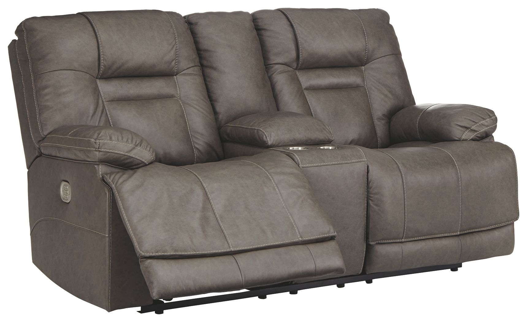 Big and bold, this power reclining loveseat with console and Easy View™ power adjustable headrests delivers comfort at the touch of a button. Easily position the recliner, its headrest and lumbar support to your liking for maximum comfort. Plus, with the convenient USB charging ports, cell phones or laptops can be charged without having to get up. The feel of heavy weight leather surrounds you via the cushioned seat, interior bustled back cushioning and pillow top armrest, while faux leather is on the back and sides for affordability. The cloud effect seen in the smoke-colored upholstery creates a rustic look ideal for your modern or casual setting. The center console tops off convenience with hidden storage under center armrest—perfect for tucking away remotes. You'll love keeping drinks within reach with the two stainless steel cup holders.