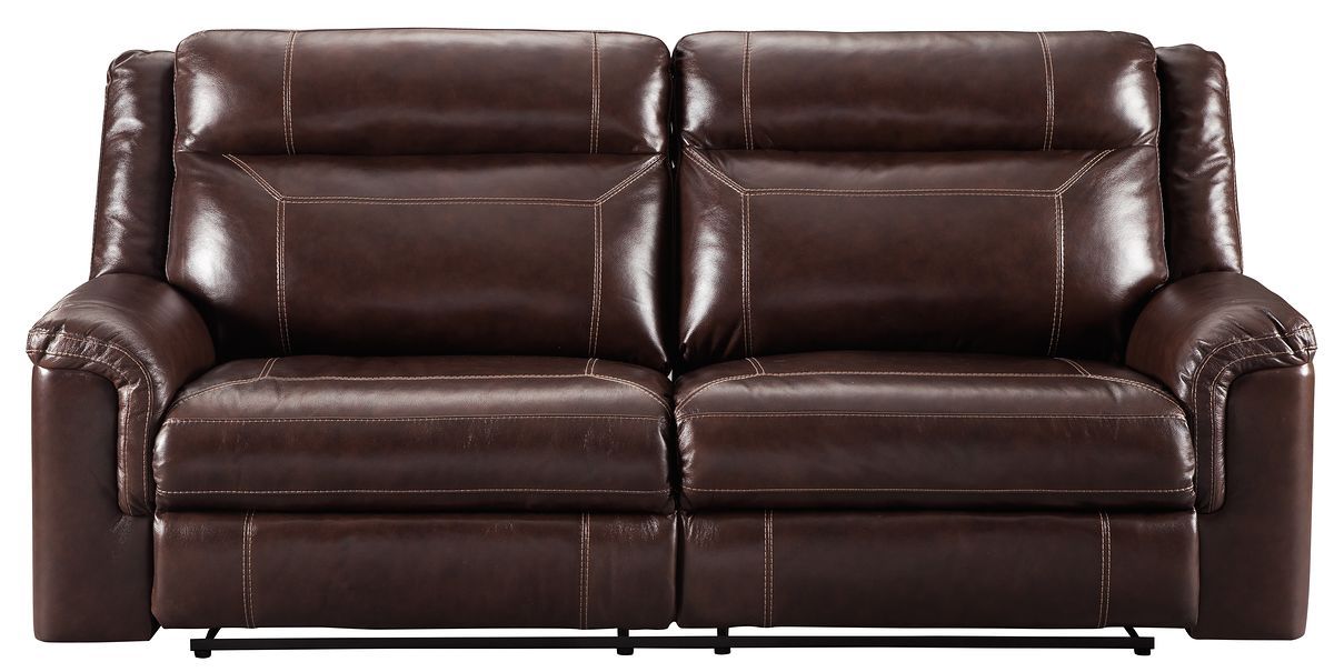 No gimmicks here. This power reclining sofa gives you all of the comfort without the bulkiness. Clean and tailored profile is elevated with contrast jumbo stitching. Feel-good upholstery is all leather on the seating area. Rich coffee brown color with two-tone effect fits right into your homey living area. One-touch buttons let you recline and adjust the headrest with ease. We go a step further to make your life easier with the convenient USB charging port.