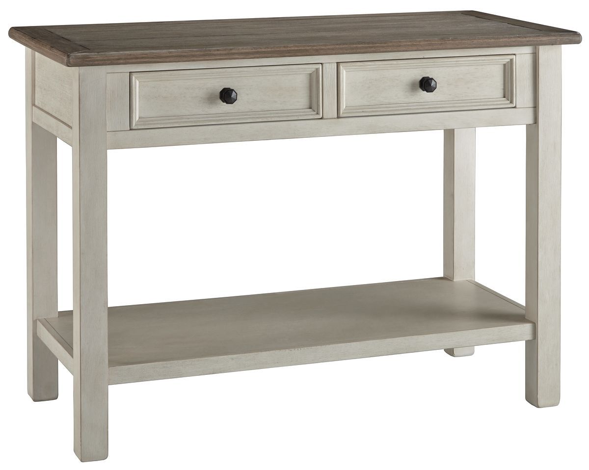 The beautiful cottage style of this sofa table gets a contemporary update. Sporting a plank-effect top and a textured two-tone finish, this sofa table blends timeworn character with modern functionality. Four convenient drawers and a spacious lower shelf lend dimension to the design.