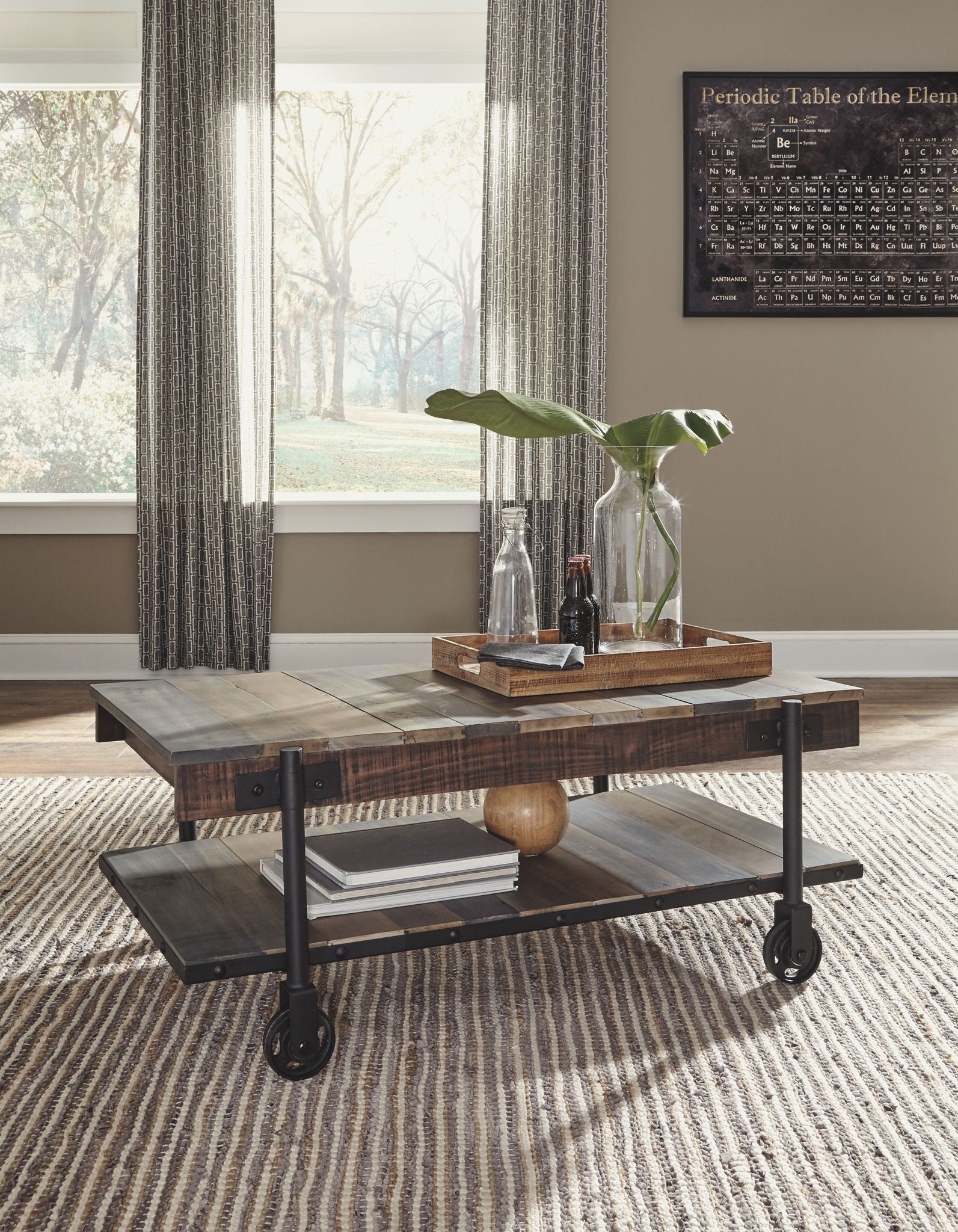 Raise the bar on urban industrial design with this solid pine and steel coffee table. With a blended brown finish and plank effect style, this rustic beauty is sure the steal the show wherever it lands. Casters on the legs provide added flexibility.