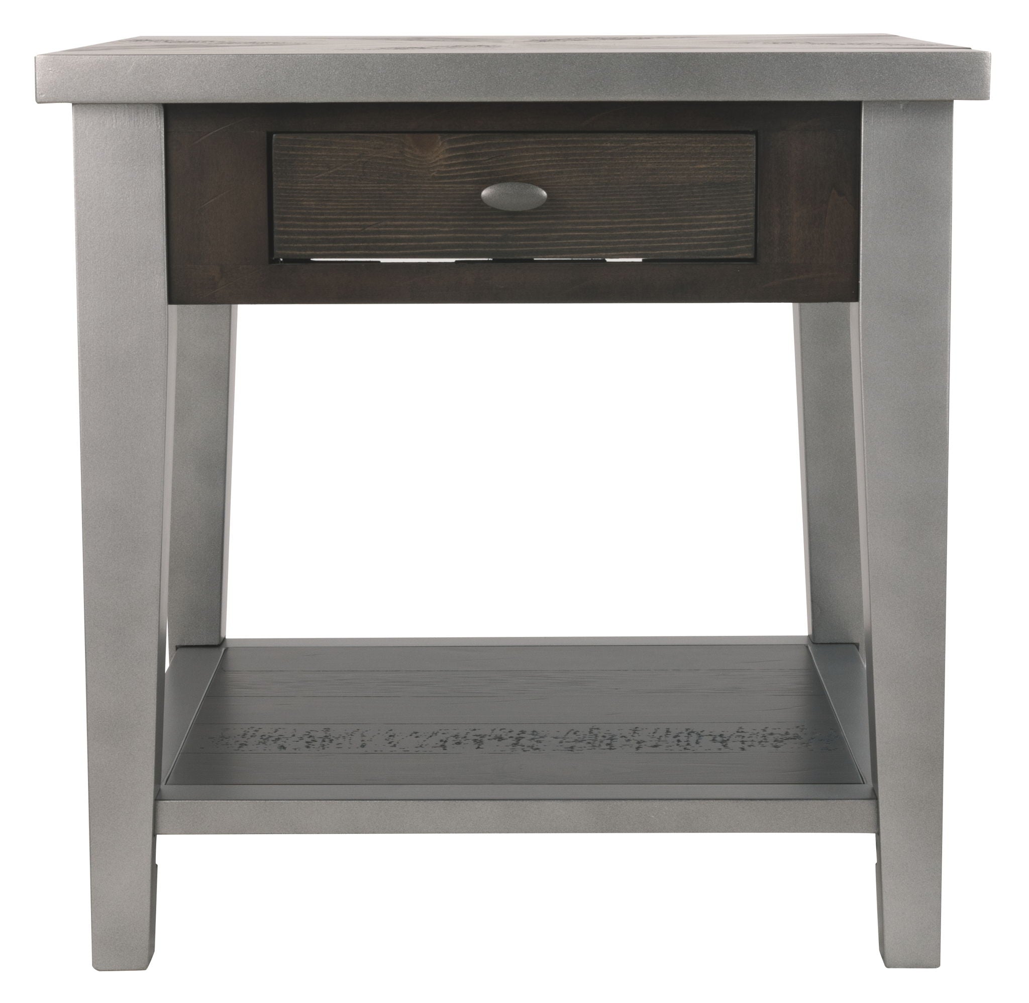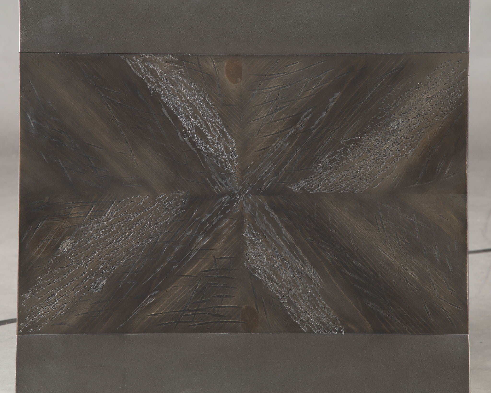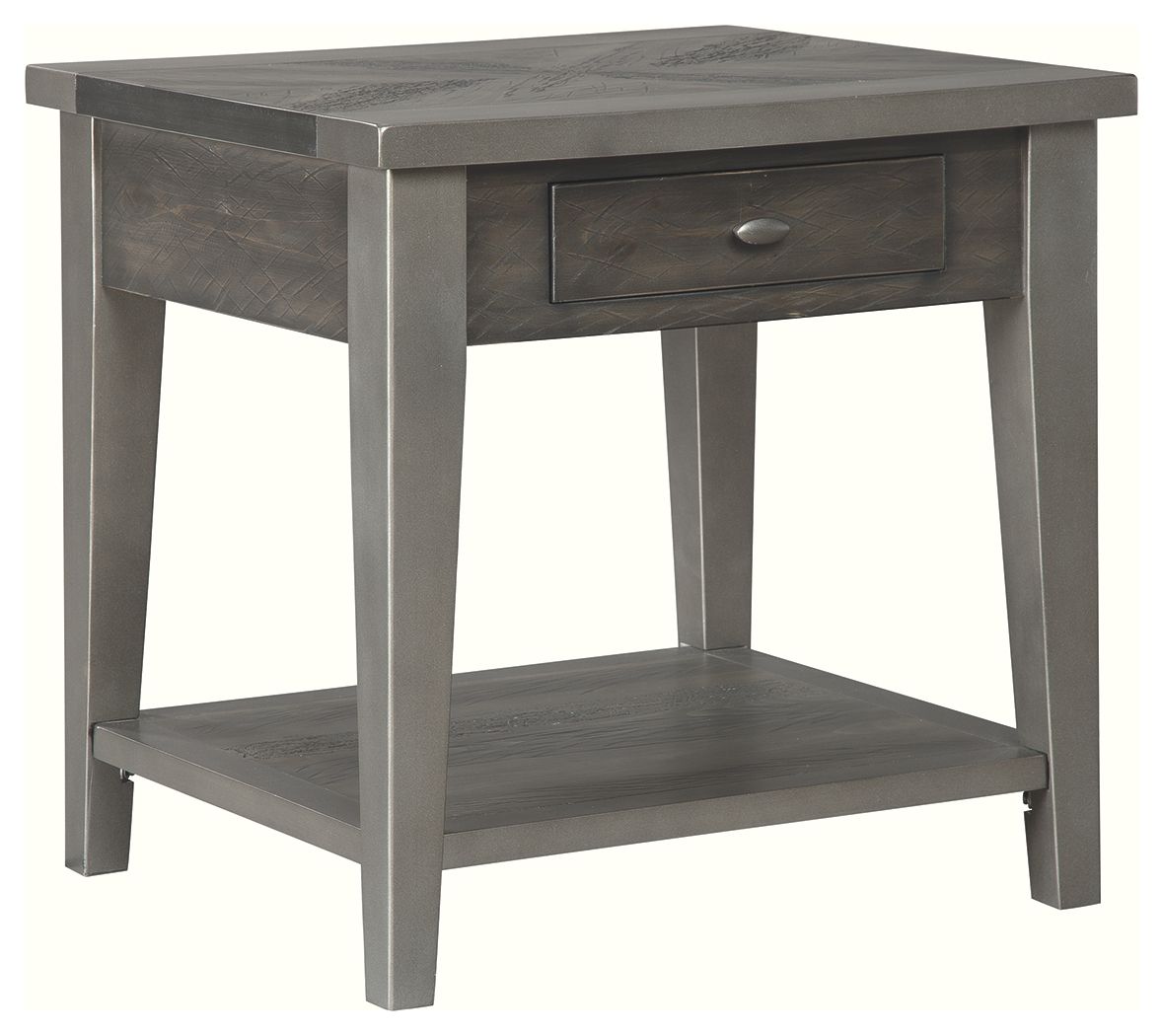 Simply striking yet remarkably detailed. That’s the beauty of this rectangular end table. Its clean-lined profile is greatly enhanced by a dramatic tabletop with butterfly veneer layup. And the finish? So complex in a rustic gray tone with hints of aged metallic. Unique oval shaped hardware on the smooth-gliding drawer rounds out the look.