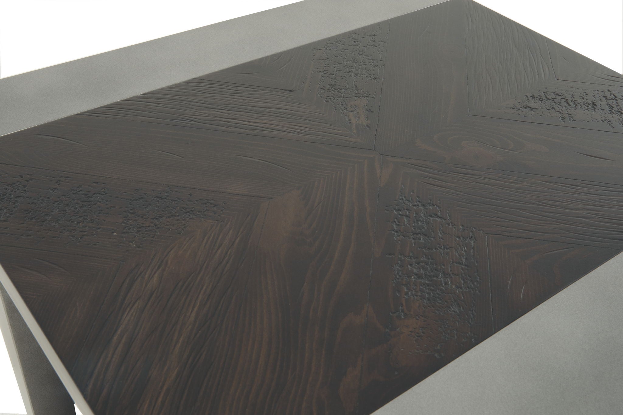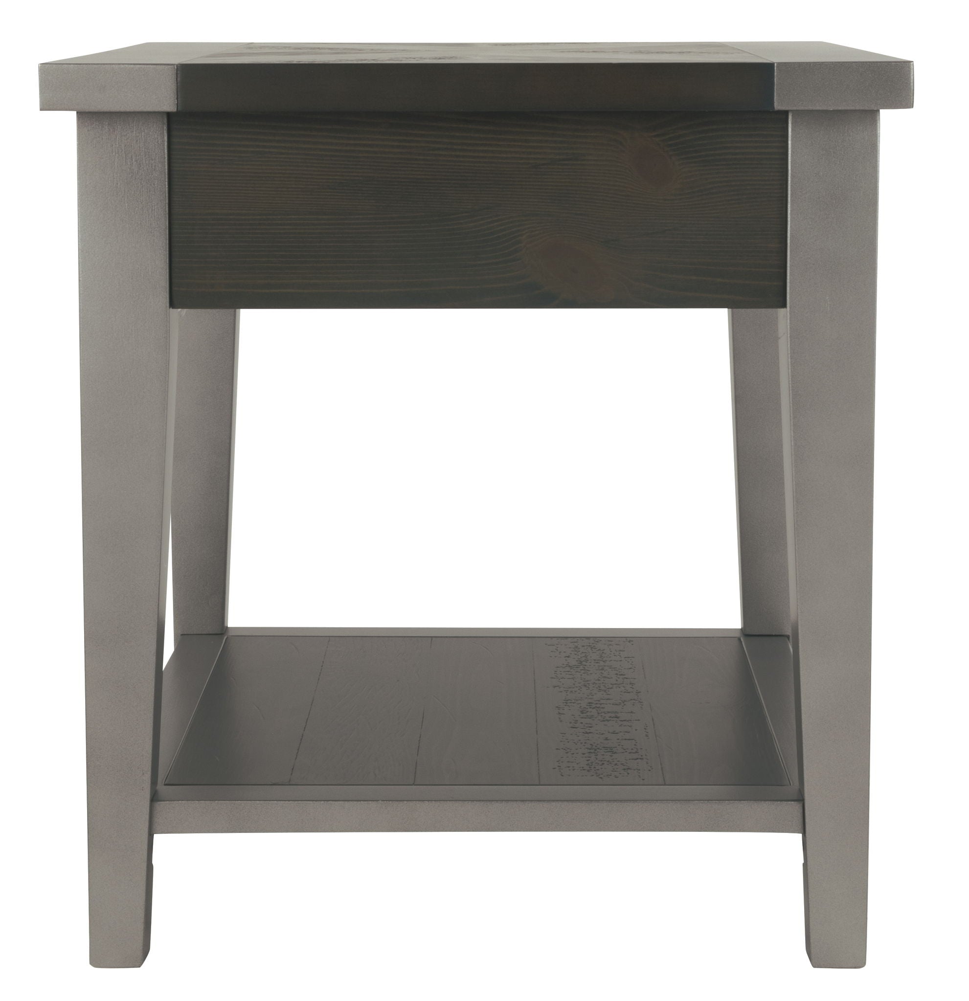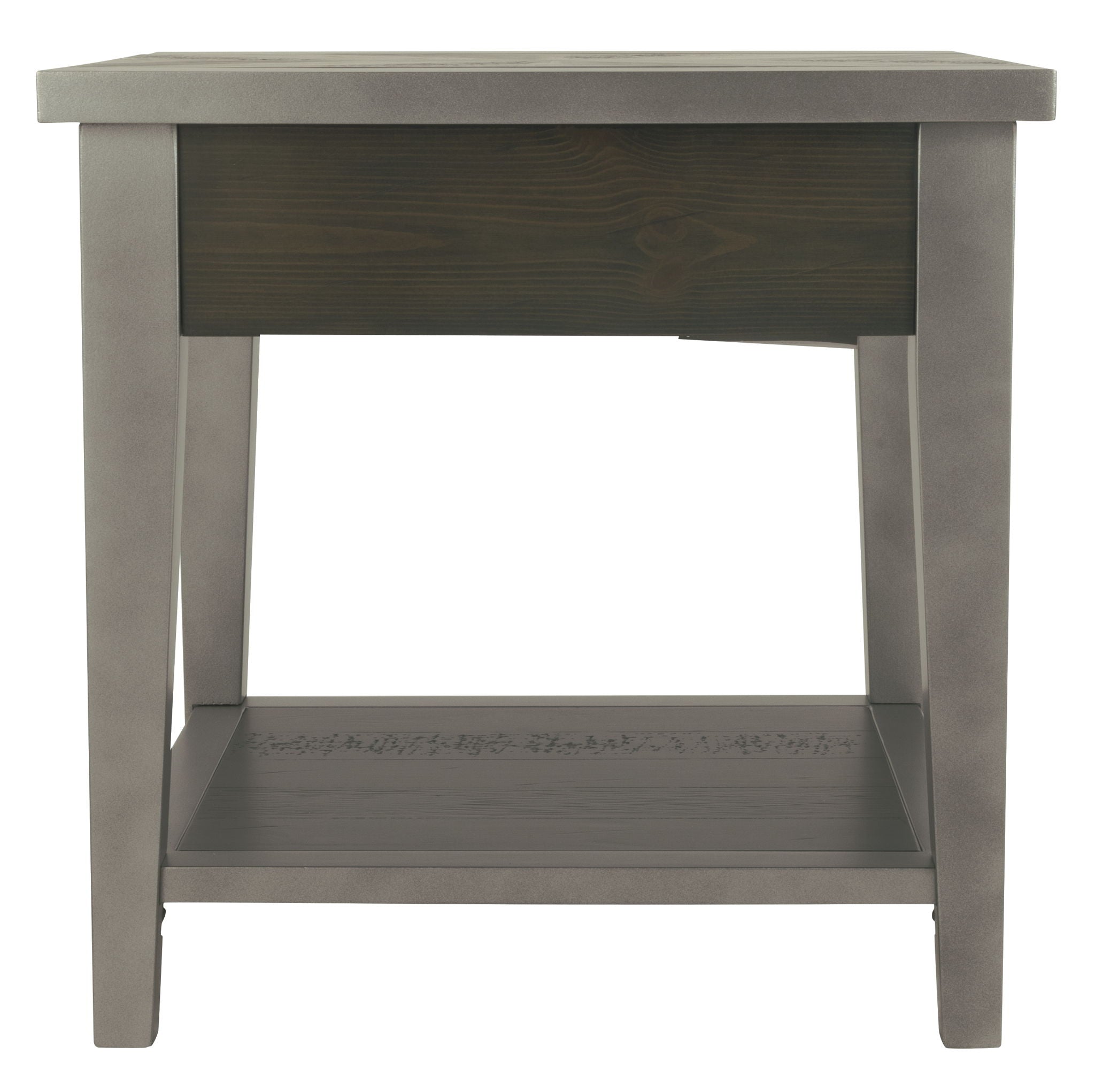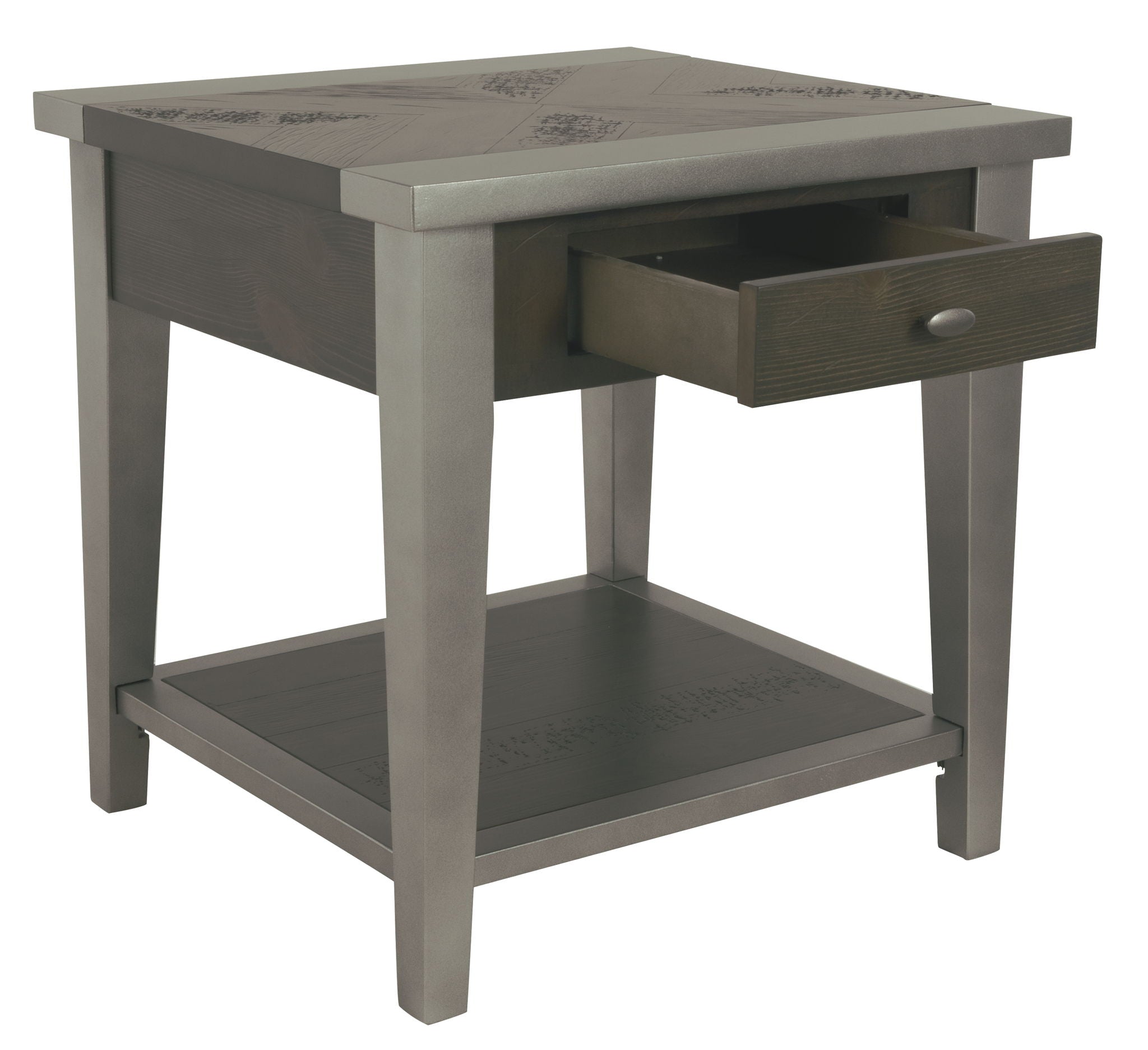 Simply striking yet remarkably detailed. That’s the beauty of this rectangular end table. Its clean-lined profile is greatly enhanced by a dramatic tabletop with butterfly veneer layup. And the finish? So complex in a rustic gray tone with hints of aged metallic. Unique oval shaped hardware on the smooth-gliding drawer rounds out the look.