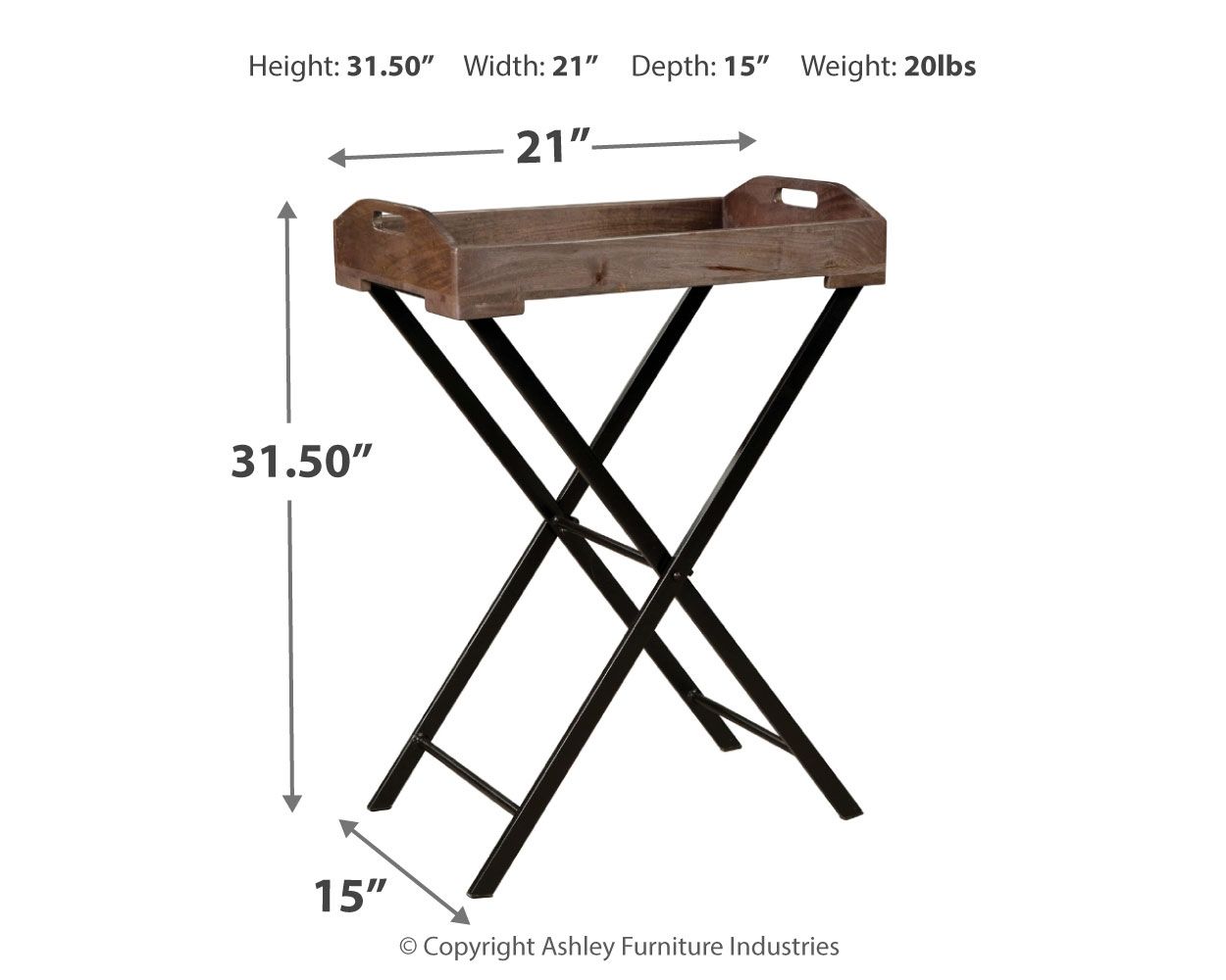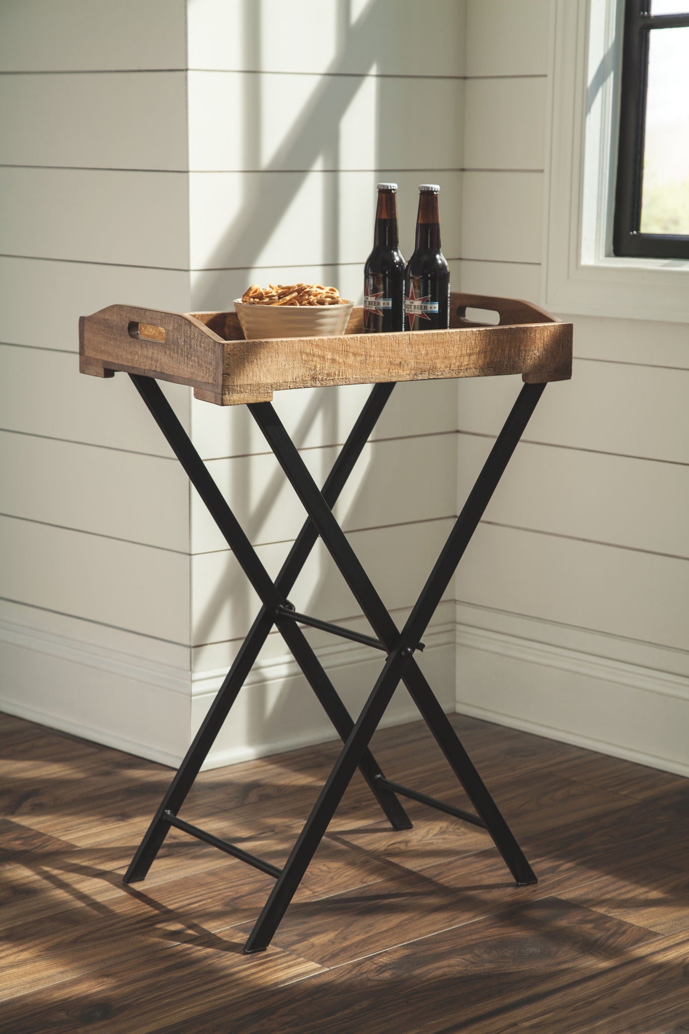 Bring your food to you with the modern farmhouse Cadocridge accent table. Removable wooden tray holds your food and beverages wherever you are. Antique gray finish of the wood embraces the beauty of natural elements. You’ll love the ease of folding the black finished metal base to put away when you’re done.