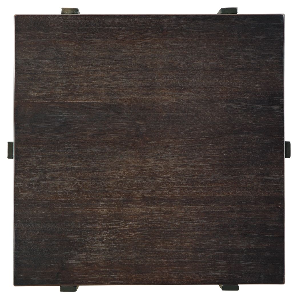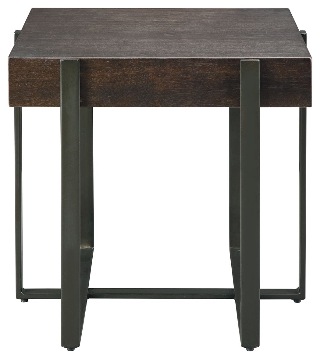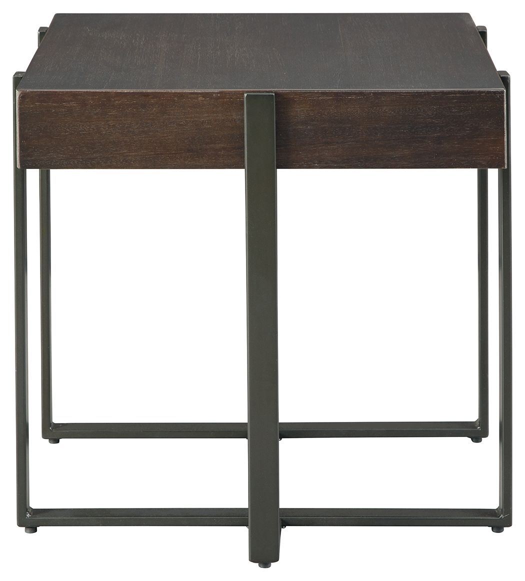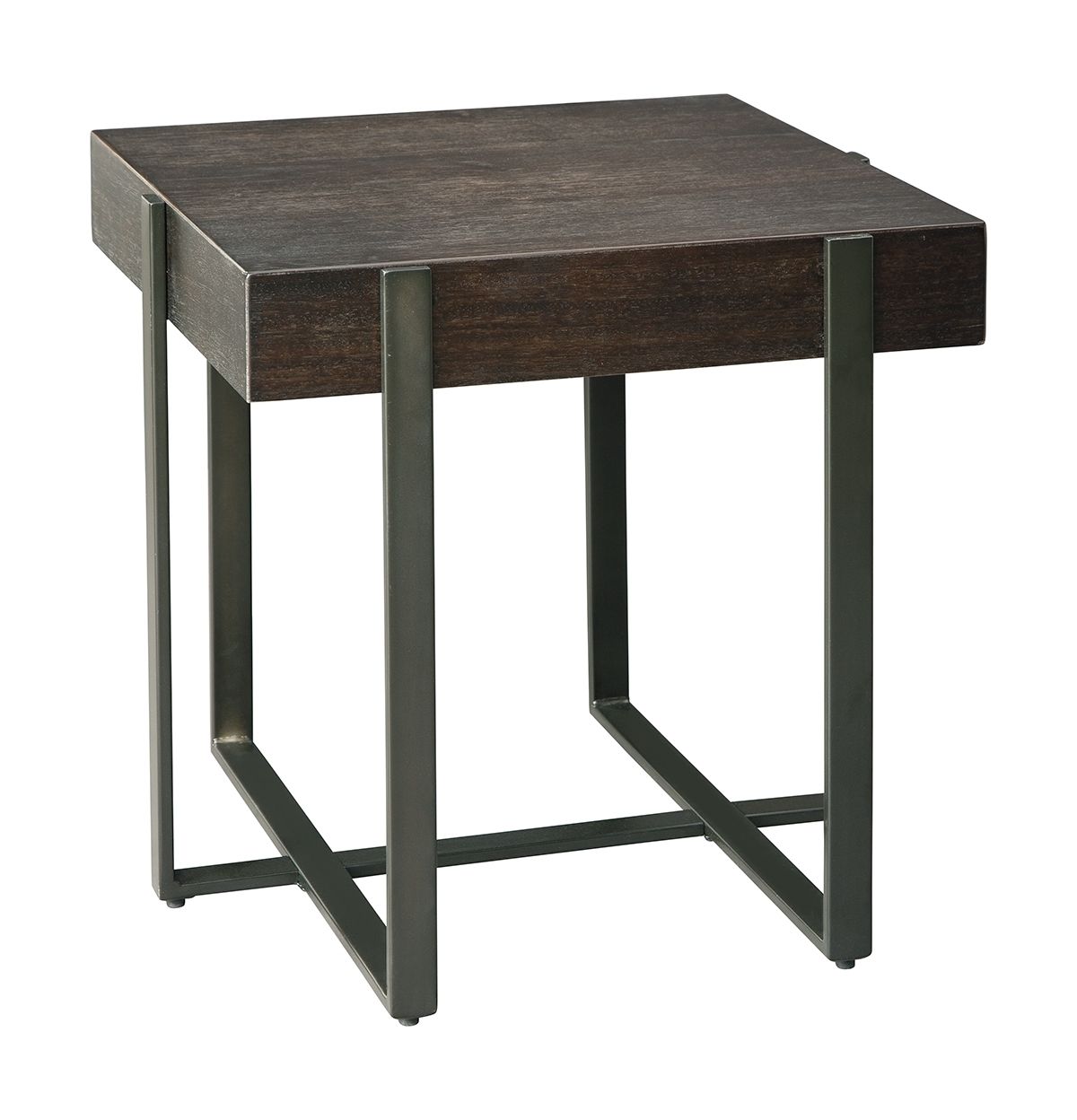 Pairing a thick slab-style top crafted of veneer and engineered wood with a linear metal base, this end table is an achievement in urban-contemporary design. The aesthetic might be ultra cool, but a dark brown finish with wire-brushed texturing keeps the feel warm and inviting.