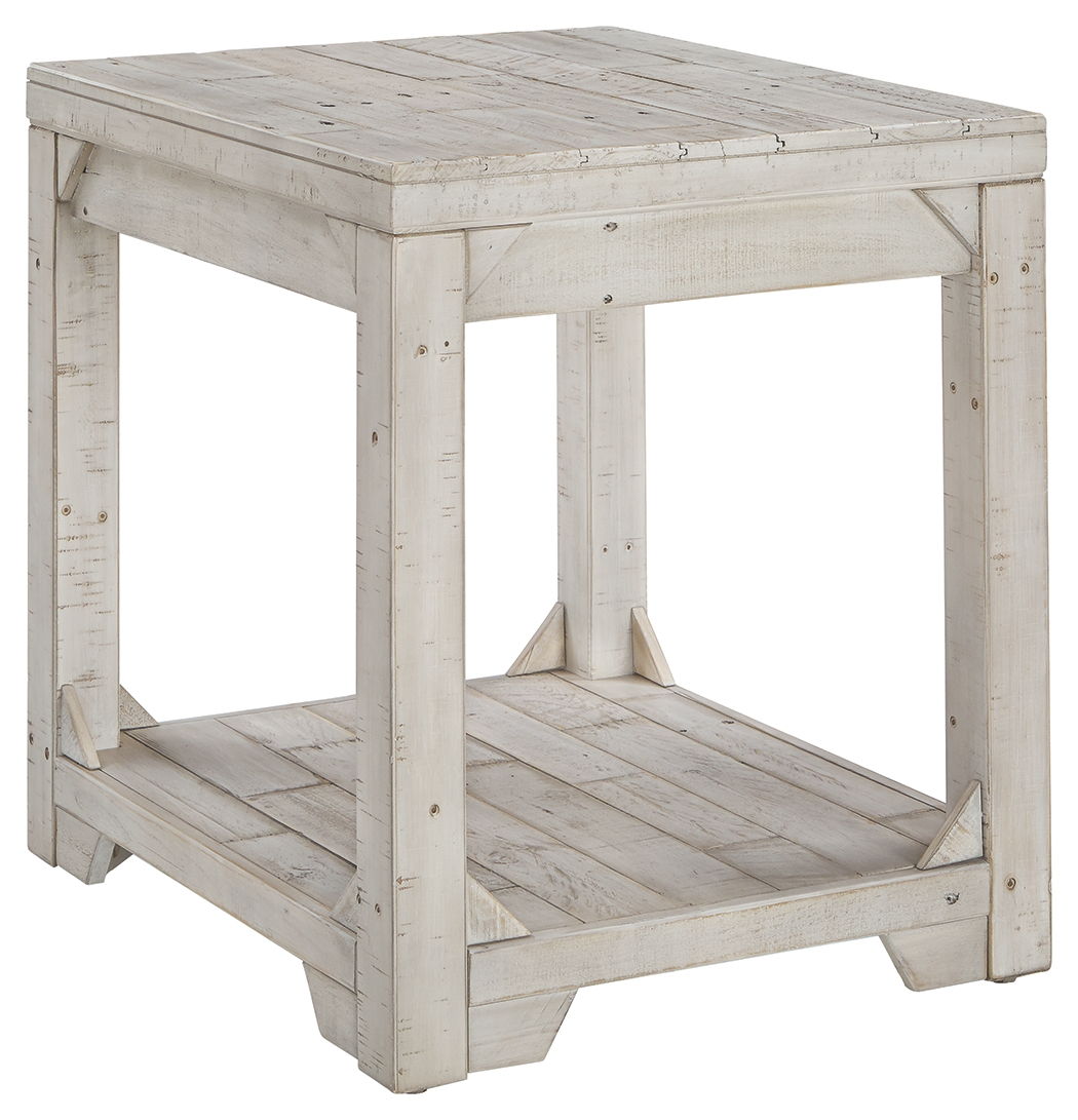 Take in the country fresh look of this end table and connect with a simpler time. Its farmhouse style is evident in its stocky design with planked top/bottom shelf, unique triangle accents and relaxed white washed finish. With a handcrafted look, you'll love the casual feel this piece brings to your living area.