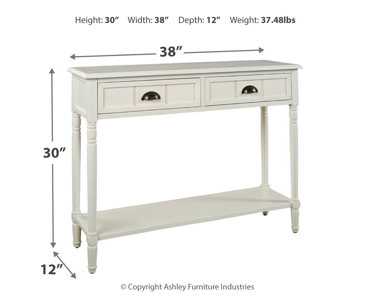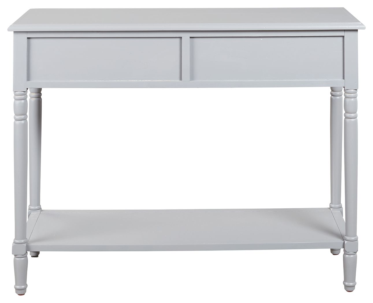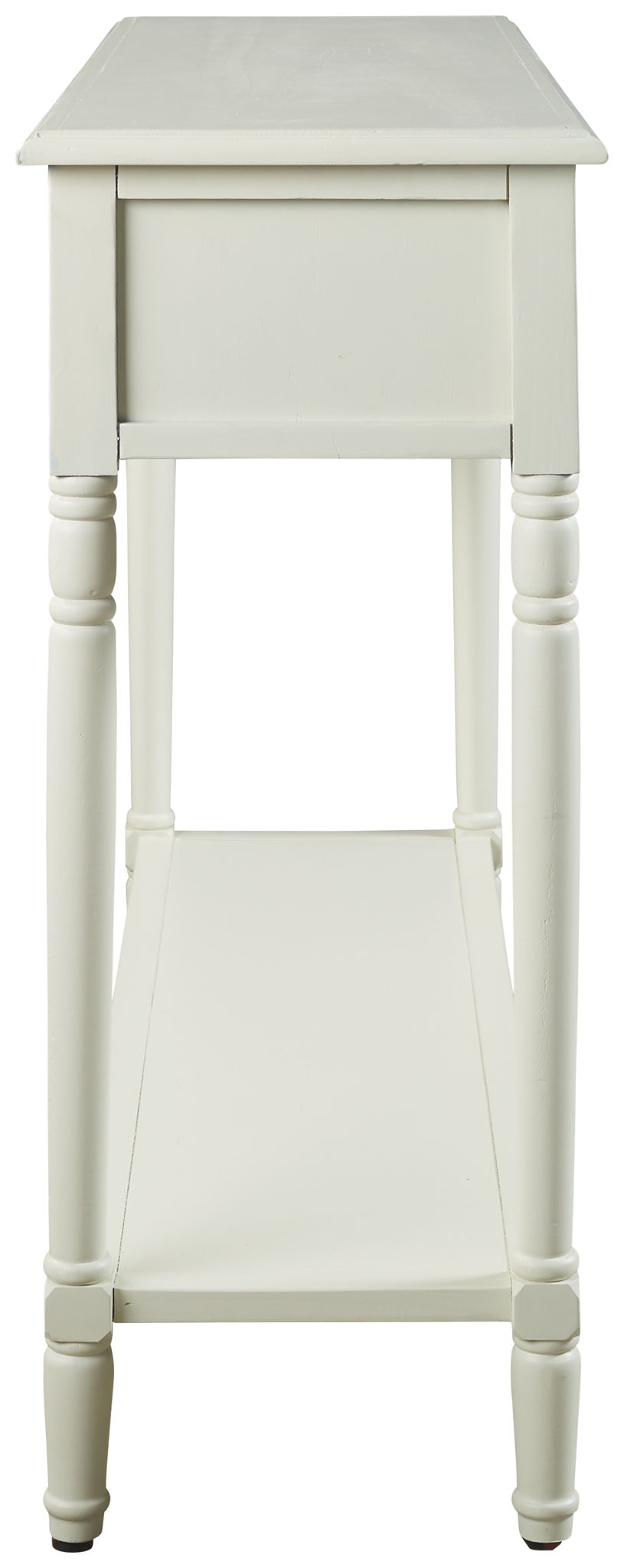 Add a touch of vintage charm and functionality to any room or hallway with this console sofa table. Its casual design is full of vintage elements like bronze-tone cupped drawer pulls, turned legs, framed drawer fronts and a classic white finish. You'll easily make use of the handy storage space that the two drawers offer. Top and bottom shelves are perfect for displaying favorite accents.