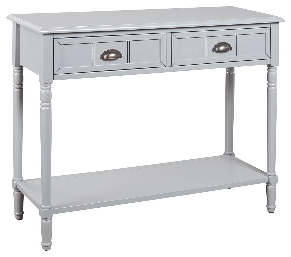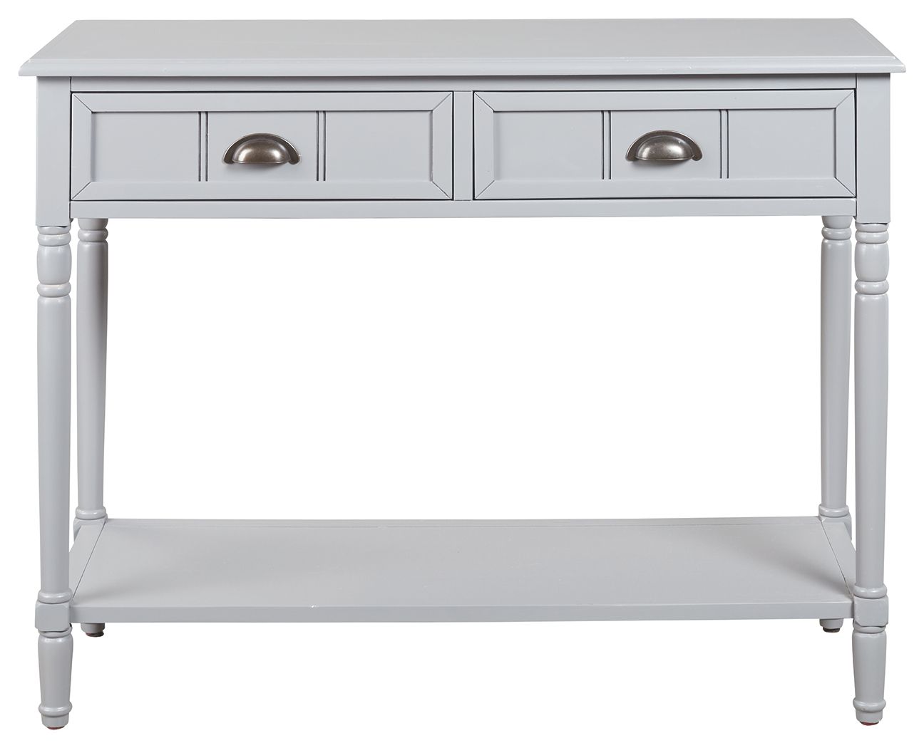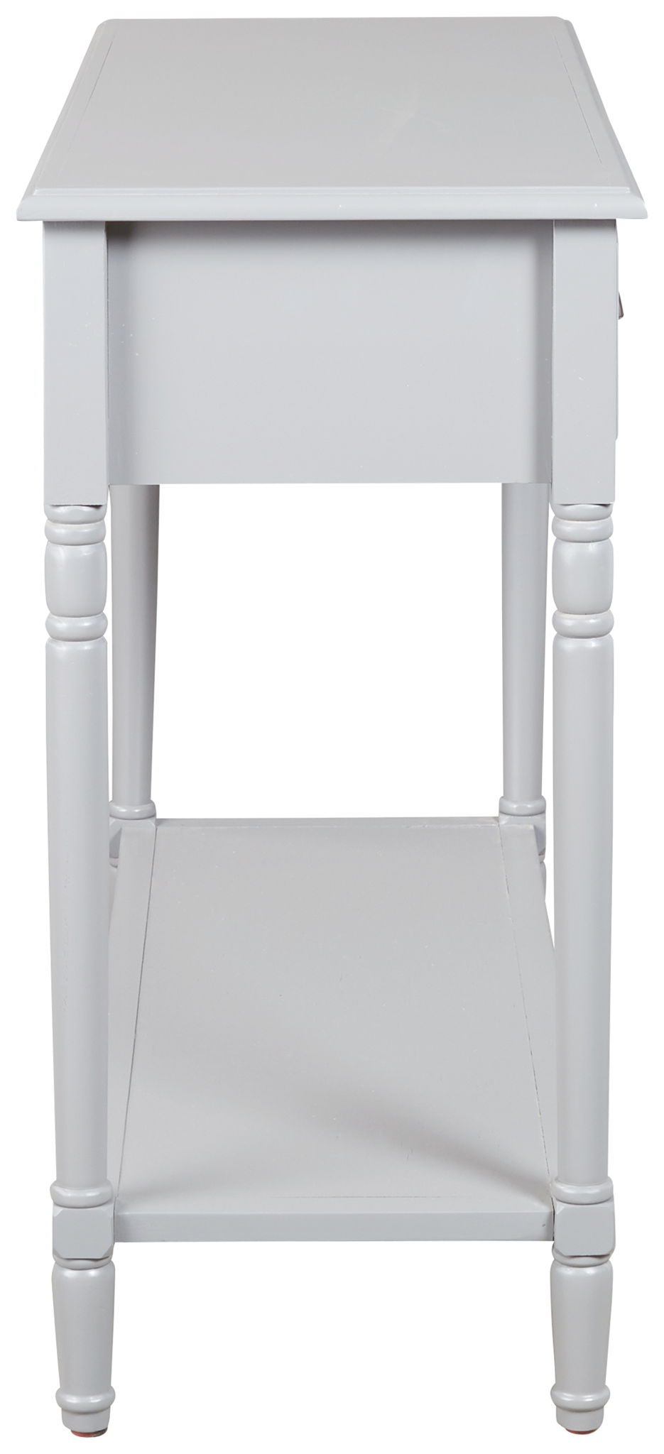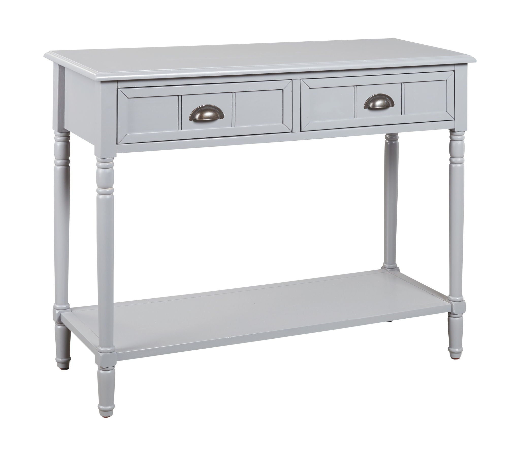 Add a touch of vintage charm and functionality to any room or hallway with this console sofa table. Its casual design is full of vintage elements like bronze-tone cupped drawer pulls, turned legs, framed drawer fronts and a classic white finish. You'll easily make use of the handy storage space that the two drawers offer. Top and bottom shelves are perfect for displaying favorite accents.