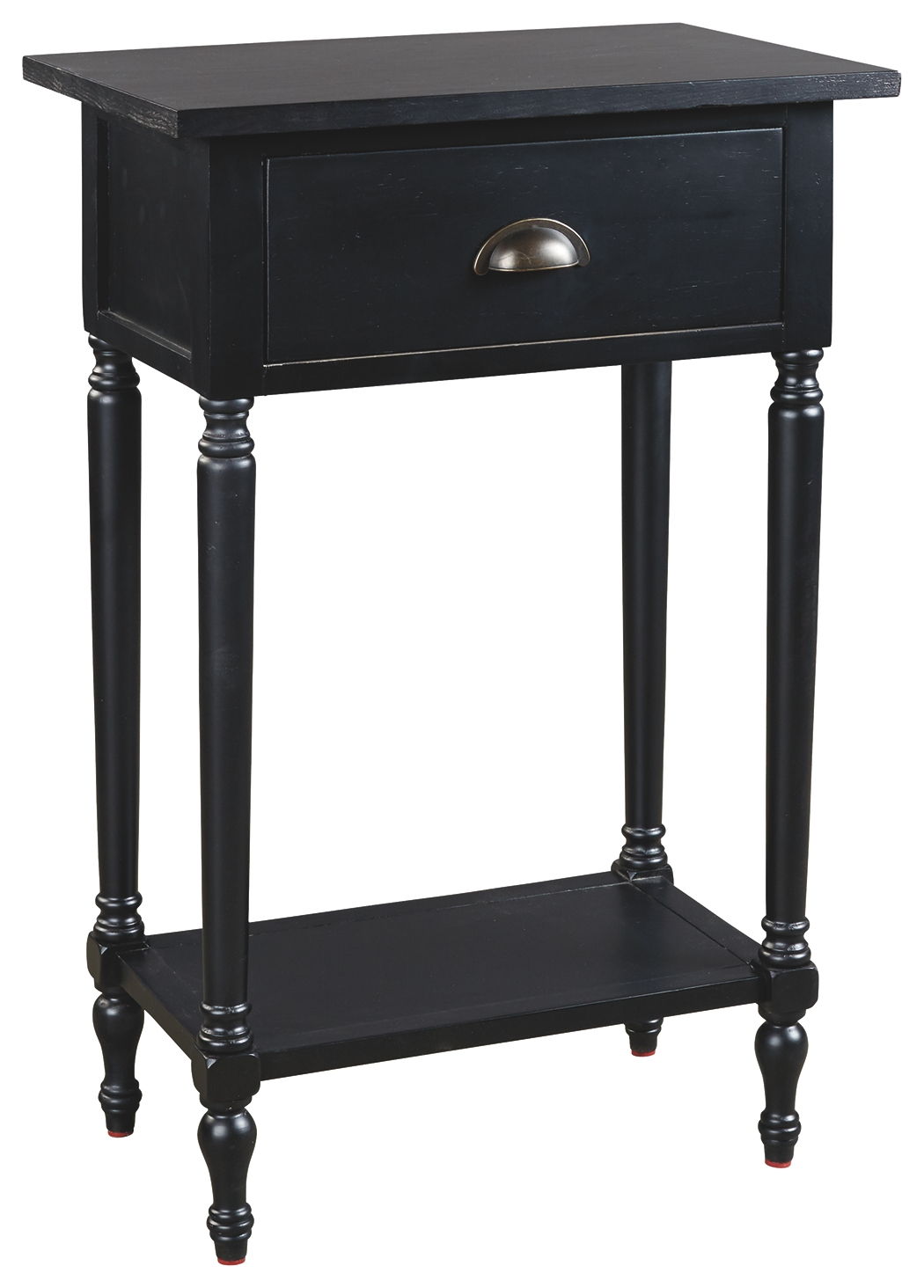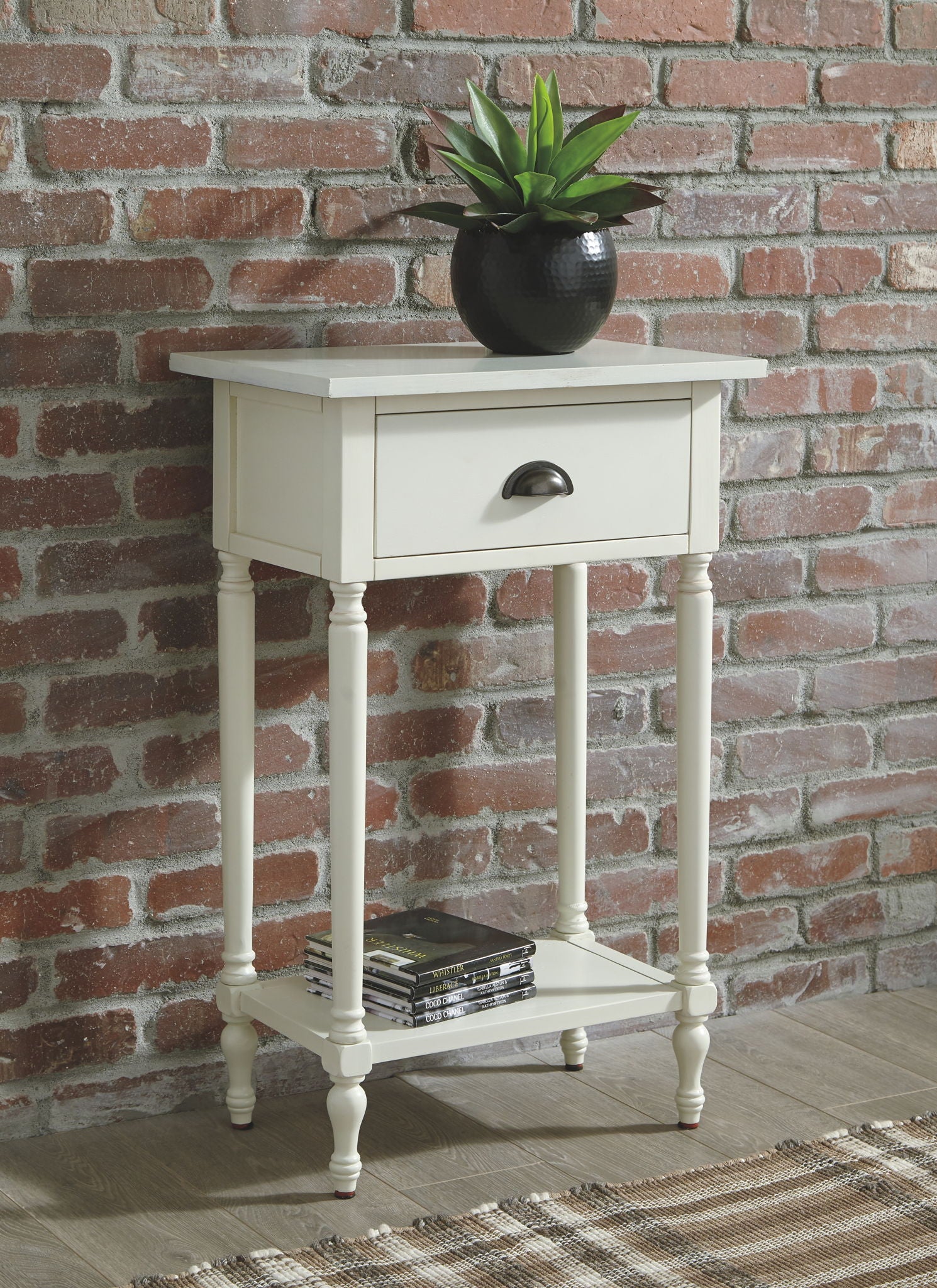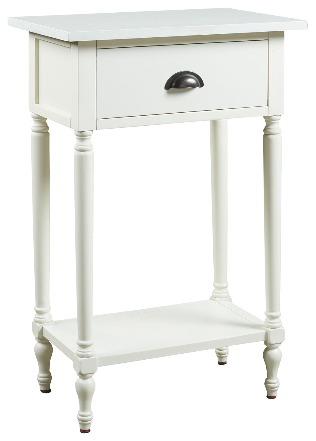 The perfect complement to any sofa, this accent table embodies quintessential vintage charm. It’s casually cool with a bronze-tone cupped drawer pull, turned legs, a framed drawer front and a classic white finish. You’ll love how the convenient drawer stores remotes and catchalls with ease. Last, but certainly not least, the bottom shelf is a hot spot for decor accents or an extra bin for tip-top organization in small spaces.