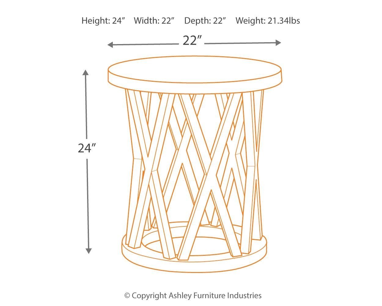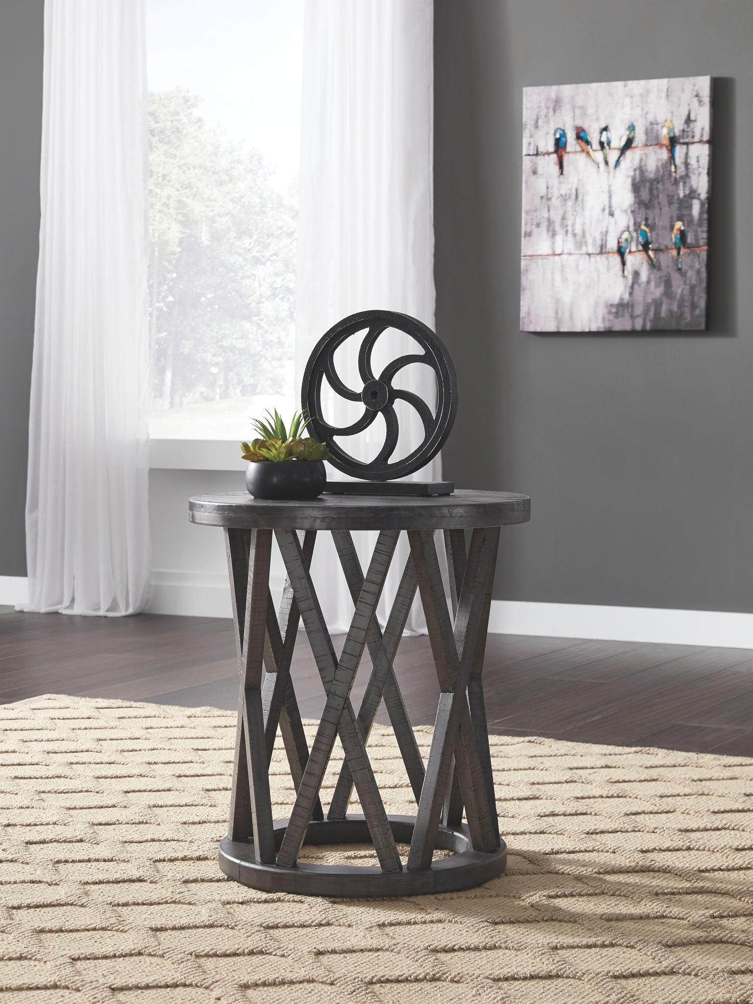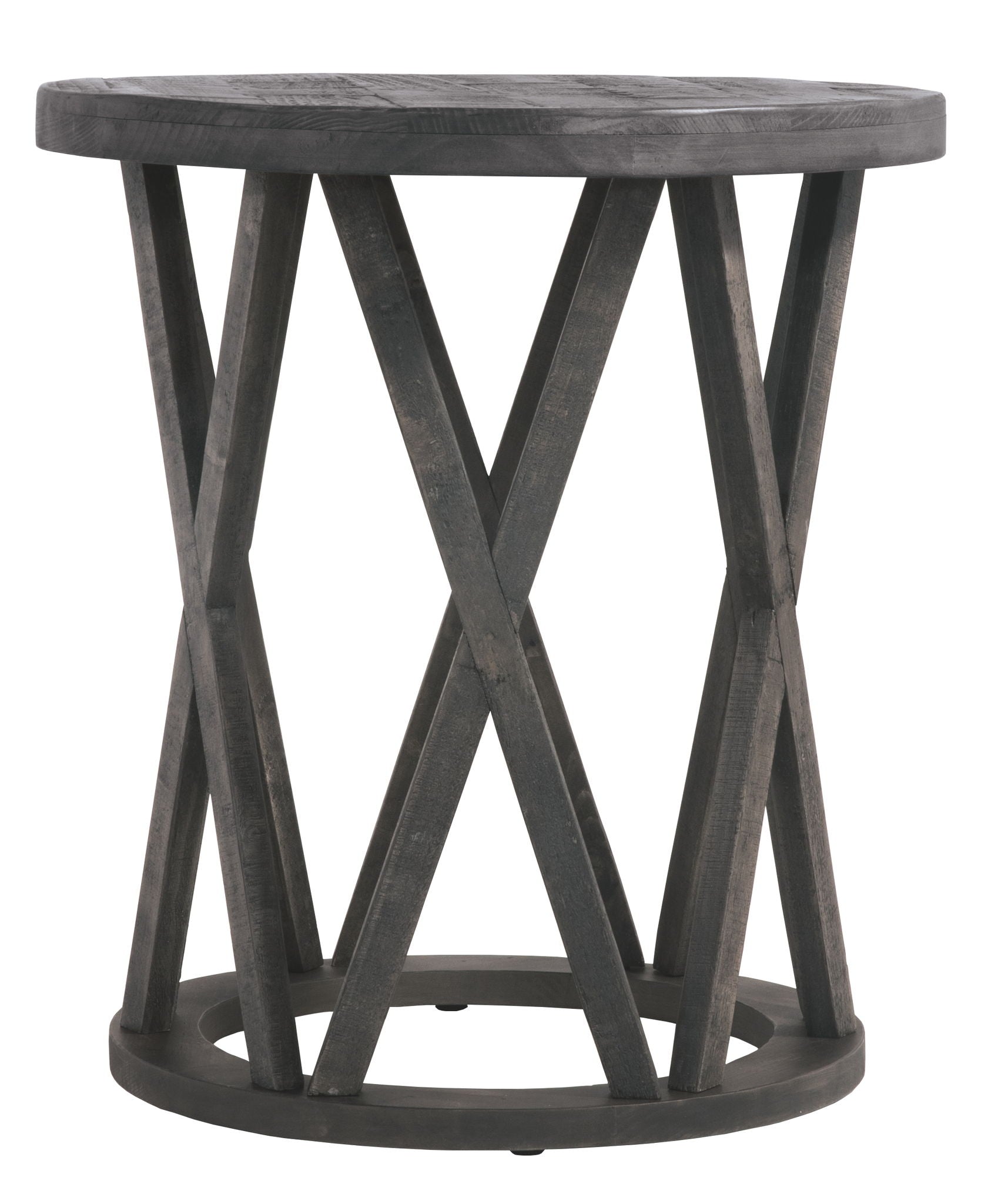 Make it bold and beautiful when you round up the rustic style of this end table. You'll love the casual look that's delivered through its transitional design. A drum shape with repeated "X" motifs form a unique base and the round top has a planking effect full of detail in a weathered finish. Saw kerf detailing adds notable character to each of the "X" motifs in the table's base—what a plus for creating a relaxed, rustic setting in your living area.