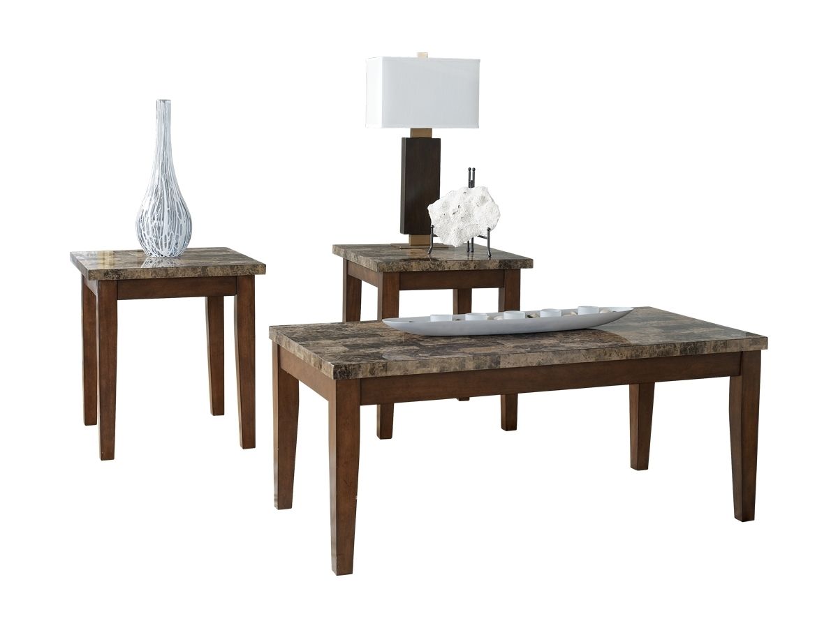 We love how this coffee table set is the perfect pairing of clean-lined contemporary style with a warm, earthy vibe. The soothing shades and textured vein of the faux marble tabletops perfectly complement the richly rustic wood-color finish.