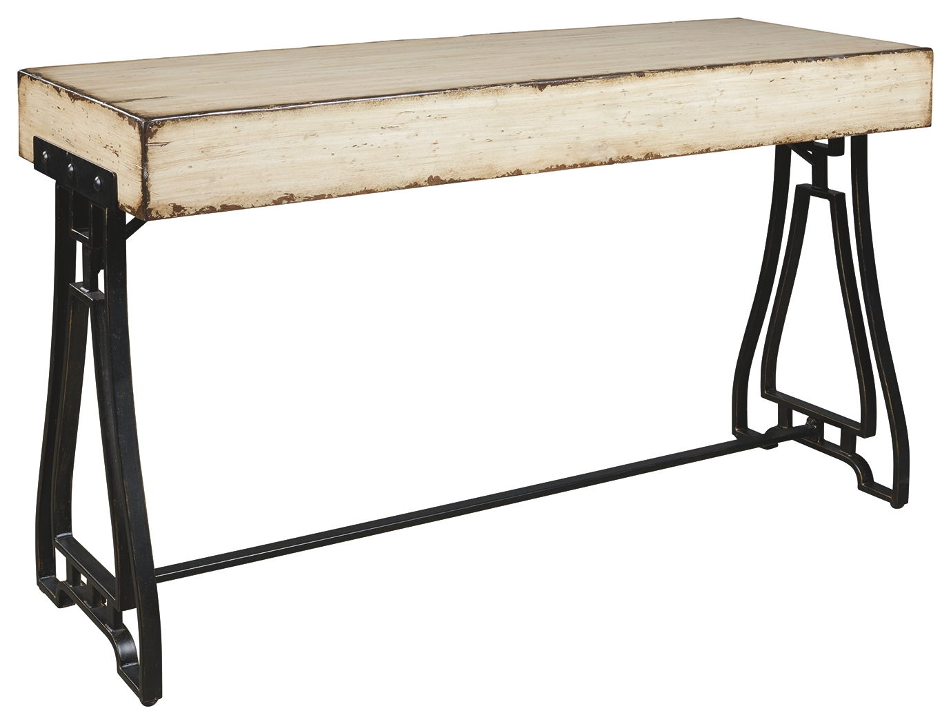 It’s all about that base with this console sofa table. Antiqued cream finish wood with dark edges infuses urban character into your home. Metal base elevates the style factor with an attractive open, geometric design. Make it yours by fashioning it with handsome decor in the entryway or behind your sofa.