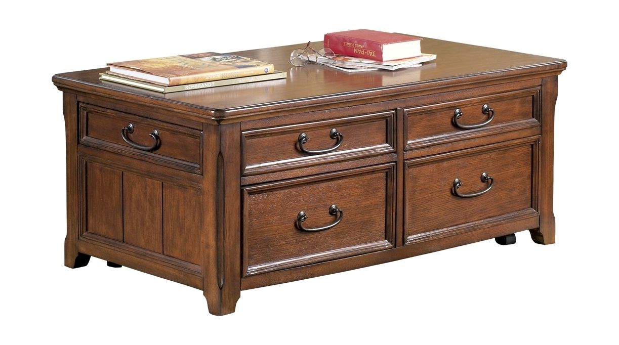Offering everything from a spring-loaded rising tabletop and front and side drawers to the option of casters—this lift top coffee table is packed with pleasant surprises. Antiqued hardware and a rich oil-rubbed stain give it a lovely vintage quality that never goes out of style.