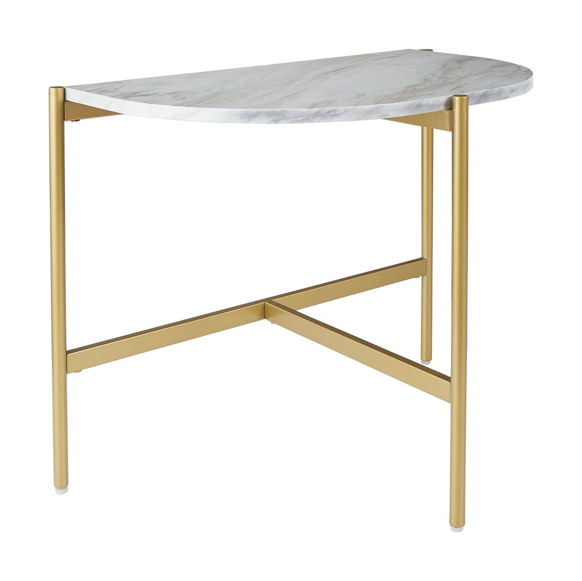 Add a bright spot to your contemporary space with this side table. The replicated Carrara marble top provides a chic sophistication while a goldtone finish on the metal frame heightens the modern aesthetic.