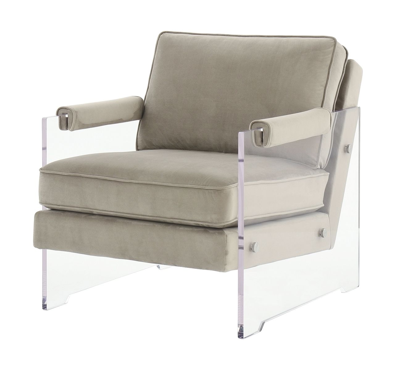 Looking for a spectacular addition to your home. This accent chair is where comfort meets fashion. The sleek, clear, modern lines and solid acrylic frame offer a light and airy feeling. The silvertone oversized metal bolts and deep comfortable seat add a stylish touch to the entire design. Upholstered in soft taupe velvet fabric with padded arm cushions for added comfort, this chair is well-proportioned to offer ultimate coziness. Sophisticated and comfortable, it will be the most stunning piece in your room.