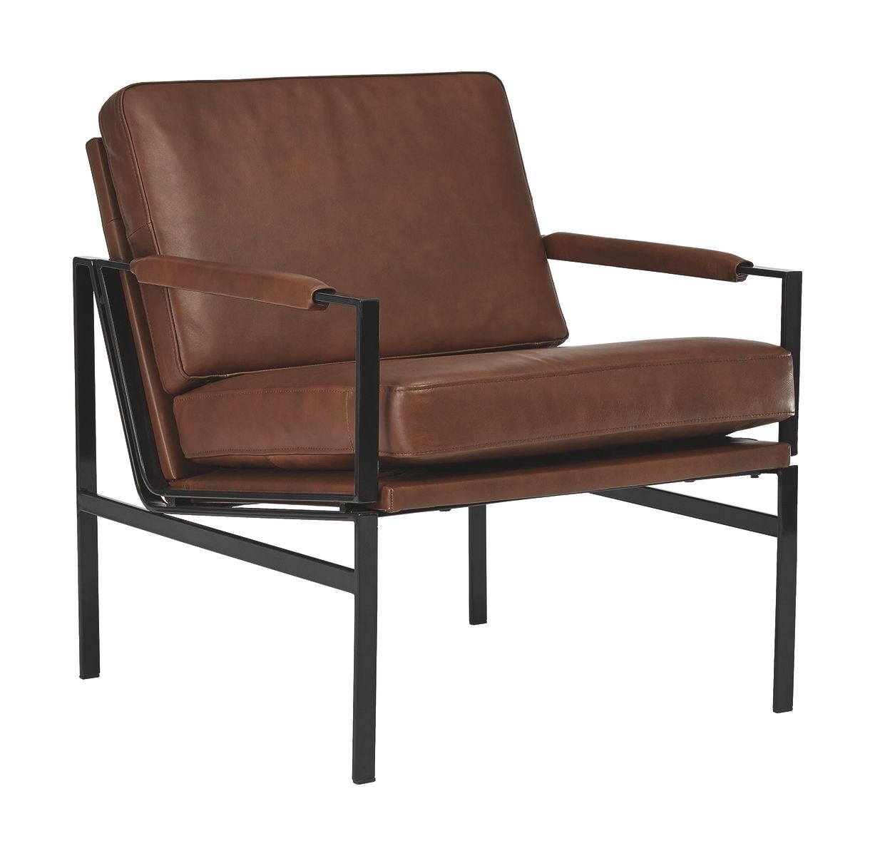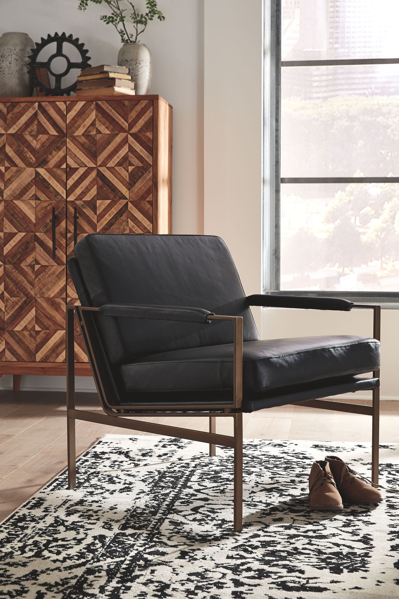 With its ultra-modern vibe and ultra-indulgent feel, this accent chair impresses with high-end looks priced to entice. Polished nickel-tone metal frame is a sleek, chic complement to the richly appointed black leather seating. Talk about the lap of luxury.