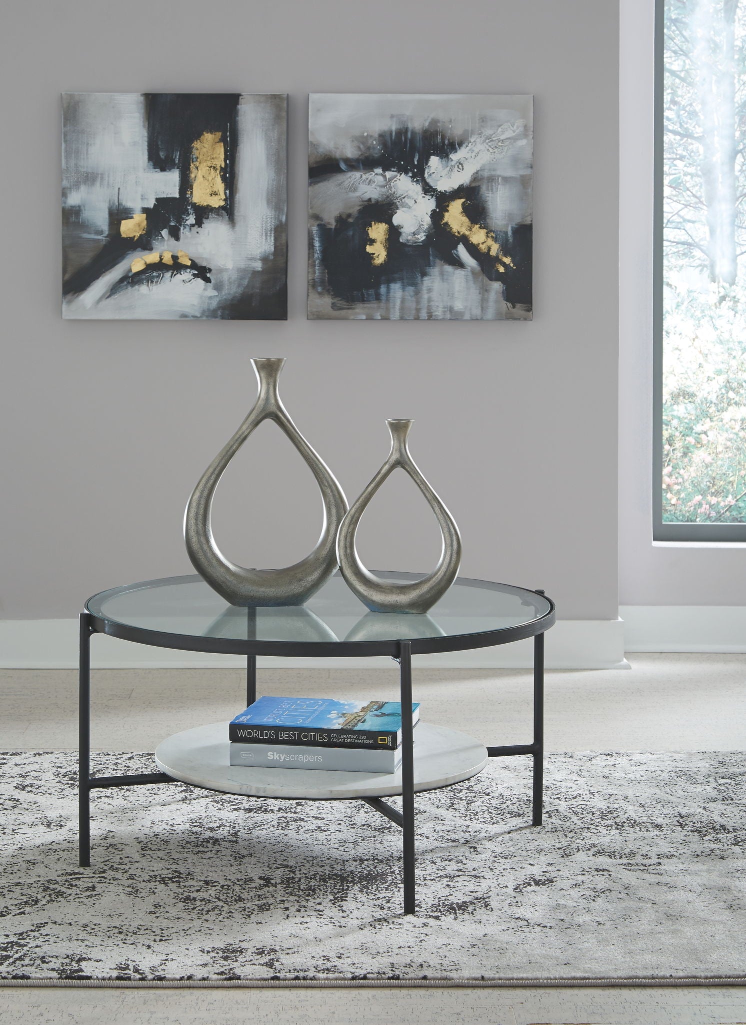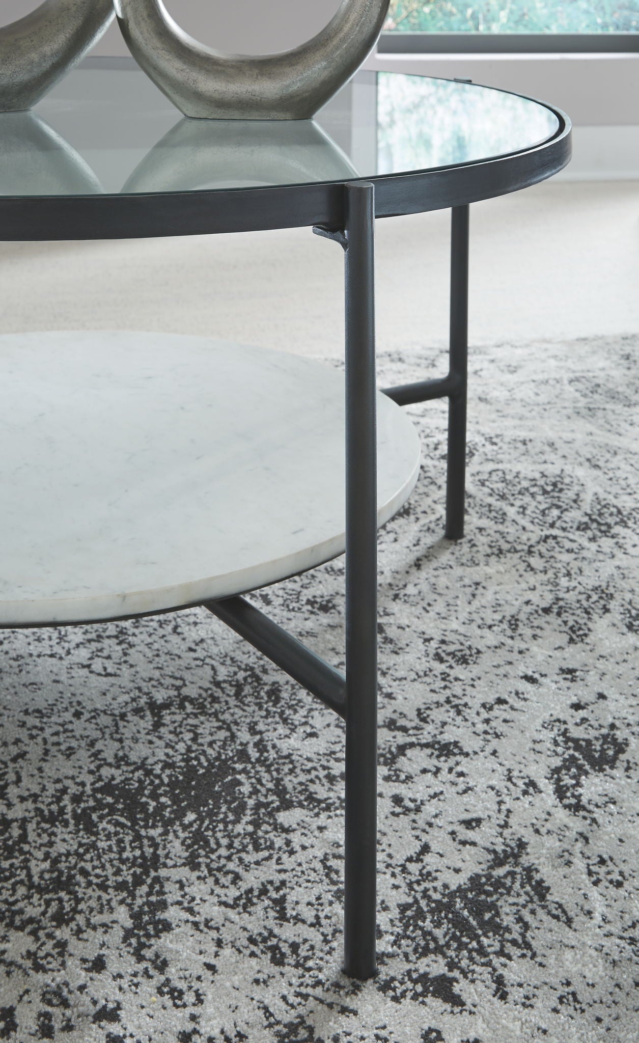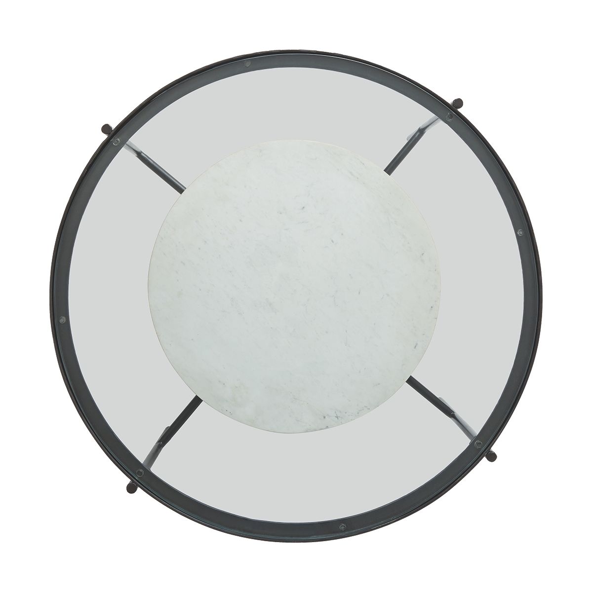 Round out your seating area with this coffee table in a contemporary two-tiered round design. Clean-lined style is simple, yet striking—while its natural white marble and glass shelves are anything but ordinary.