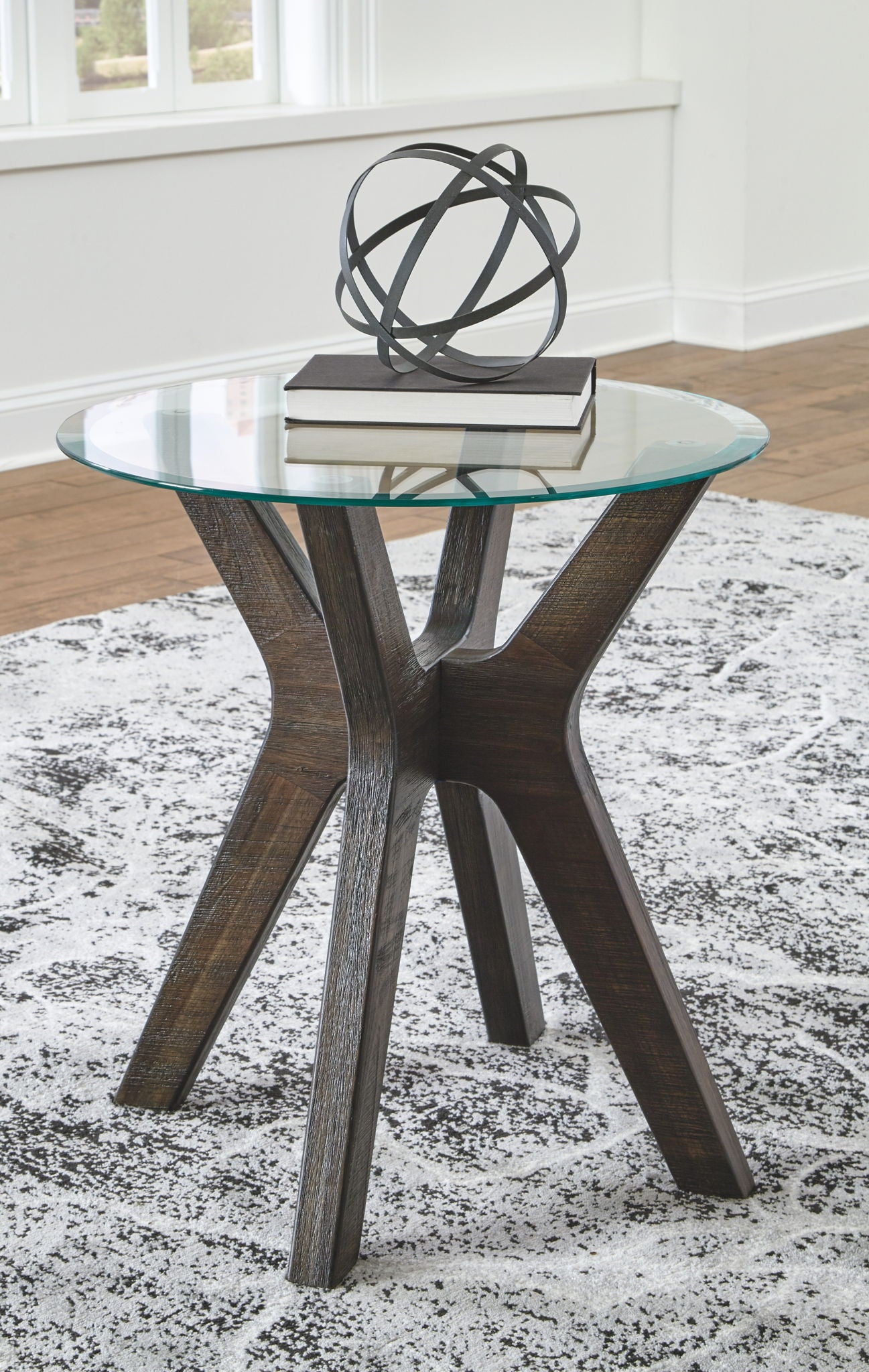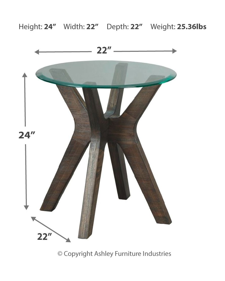 A thoroughly modern interpretation of mid-century design, this round end table combines form with function. Flared sculptural base with tempered glass top is equally at home in a boho-chic retreat or urban industrial oasis. Brushed gray finish keeps the look relevant and on trend.