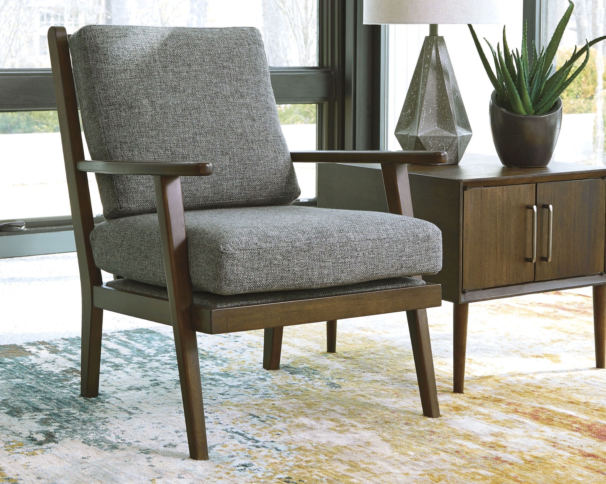 Feed your mid-century modern nostalgia with a contemporary twist in this accent chair. Colored in an attractive gray, it’s upholstered in a timeless texture. Tapered legs and arms are a nice revival. Linear profile with two soft cushions adds plenty of fresh style, perfect for small spaces.