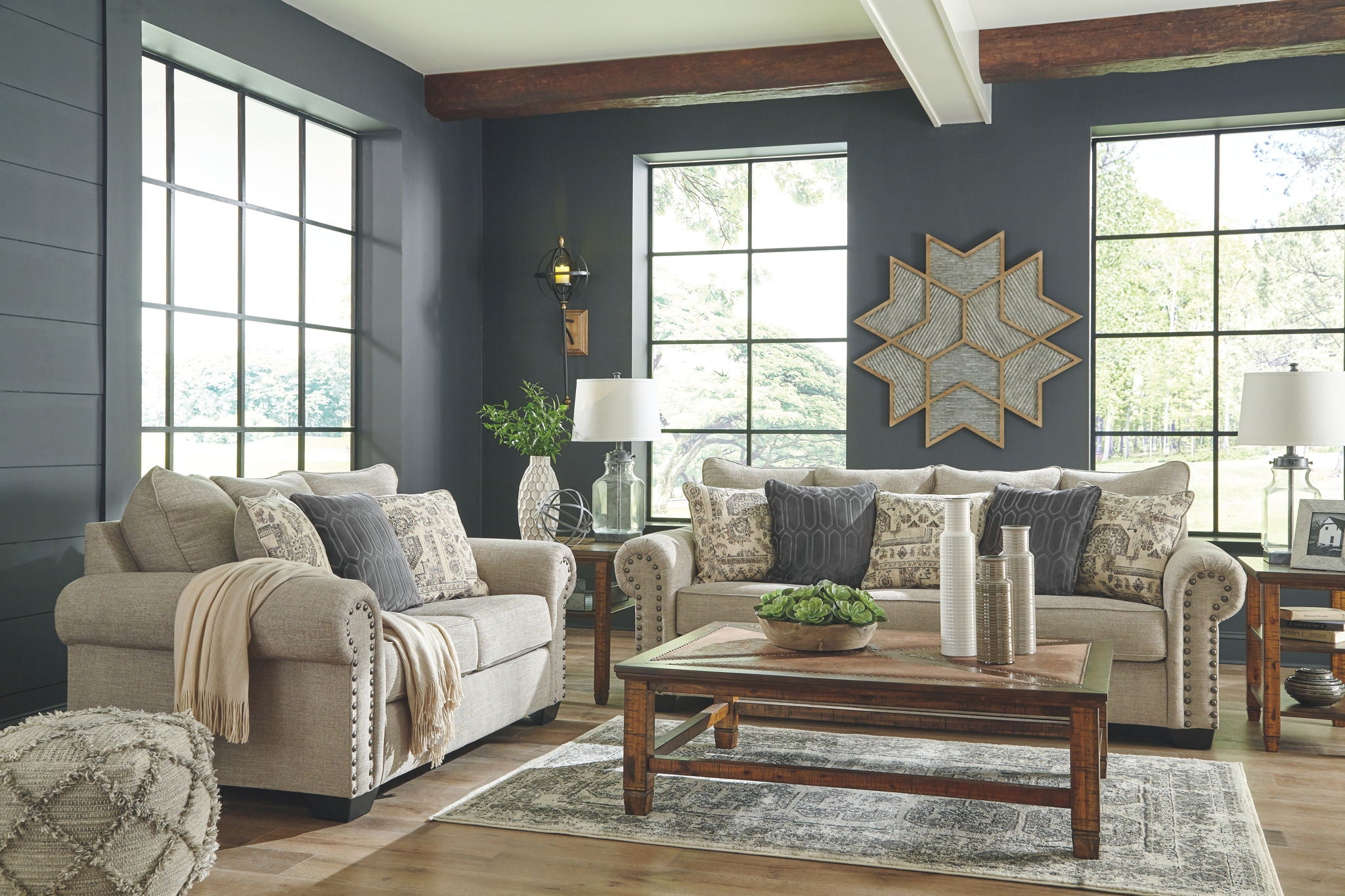 This loveseat lets you make a high-style statement at a comfortably affordable price. Richly traditional roll arms are given a modern punch care of oversized nailhead trim in a black nickel-tone finish. Linen-weave upholstery in fresh and clean sandstone beige is complemented with designer pillows that add texture and sophistication.